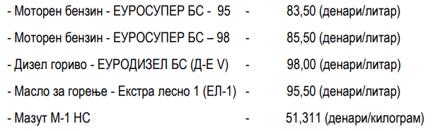 Новите цени на горивата се: Еуросупер БС-95 – 83,50 денари за литар (намалување од 0,50 денари); Еуросупер БС-98 – 85,50 денари за литар, односно овде нема промена; Еуродизел – 98 денари за литар (+2,50 денари); Екстра лесно масло (ЕЛ-1) – 95,50 денари за литар (+3 денари); Мазут М-1 НС – 51,311 денари за килограм (зголемување од 0,901 денар).