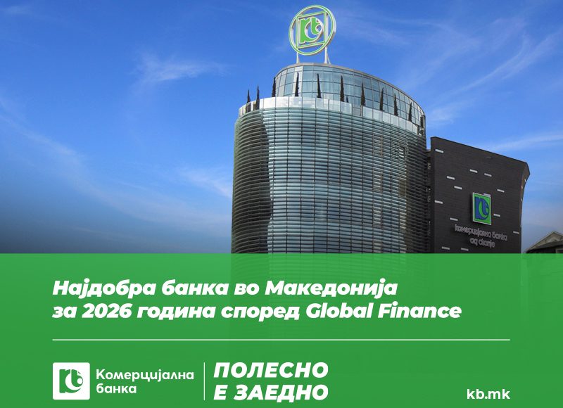 Со особена чест и задоволство објавуваме дека Комерцијална банка по јубилеен 15-ти пат е прогласена за „Најдобра банка во Македонија за 2026 година“ од угледниот финансиски магазин Global Finance. Оваа престижна меѓународна награда за Банката претставува силна потврда за континуираниот развој, стабилноста, иновативниот пристап, високата грижа за клиентите и значајниот придонес за домашната економија.