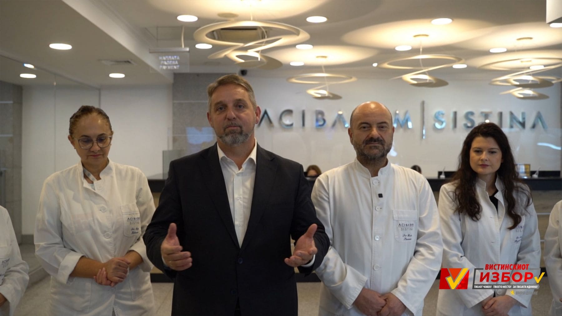 Сакам да ве поздравам да ви кажам добар ден од нашата најголема приватна здравствена установа Аџибадем Систина чии сме гости денеска, јас и мојот тим на заеднички иницијативи со цел да направиме нешто во делот на здравствените прегледи, на превентивата како и третманите, за нашите сограѓани.