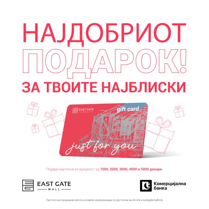 Ист Гејт Мол и Комерцијална Банка известуваат дека „Ист Гејт подарок-картичката“ е на понуда и доаѓа токму во пресрет на најубавите празници во годината.