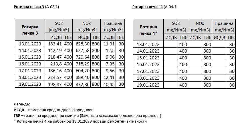 Неделен извештај за измерени средно-дневни вредности на емисии од главните емисиони точки во Цементарница УСЈЕ (13.01.2023 – 19.01.2023)