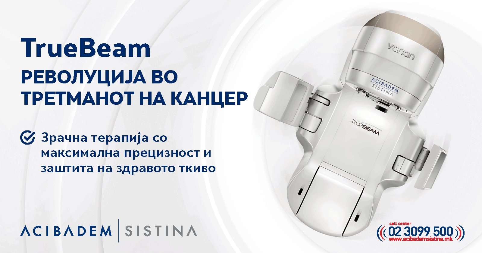 Клиничката болница „Аџибадем Систина“ го воведе напредниот линеарен акцелератор кој е целосно интегриран за изведување на радиотерапија и радиохирургија. TrueBeam од реномираниот производител Varian Medical Systems овозможува извонредна прецизност и ефикасност при третманот на дури и најсложените видови карцином, како што се: тумори на белите дробови, абдоменот, главата и вратот, мозокот и дојката.