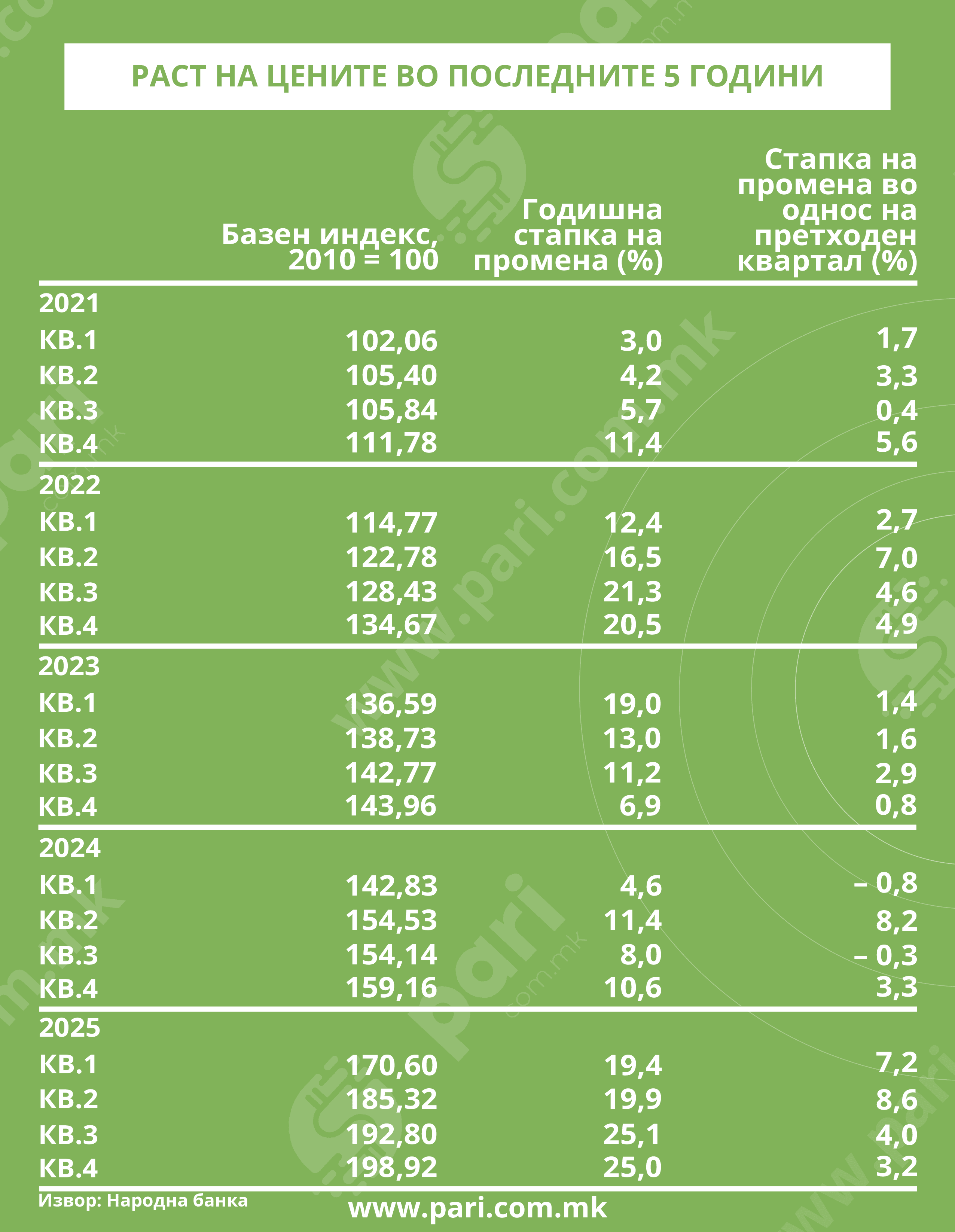 Ако пред 15 години сте имале 100.000 евра заштеда, тогаш сте можеле да купите два стана по 50 квадратни метри. Но, сега можете да купите еден. Или, ако парите се гледаат како средство за инвестирање во недвижности, сте загубиле пари точно за еден стан. Така покажуваат податоците од Народната банка за цените на становите, застапени во анализата на „Пари“. Според нив, ако 2010 година се земе како базна година, односно ако тогашните цени се со индекс со база 100, четвртиот квартал од 2025 година има индекс од 198,92, што значи дека цените се зголемиле за безмалку 100 насто. Со секој месец од 2026 година состојбата веројатно е уште подраматична затоа што сите податоци покажуваат дека растот на цените не престанува.