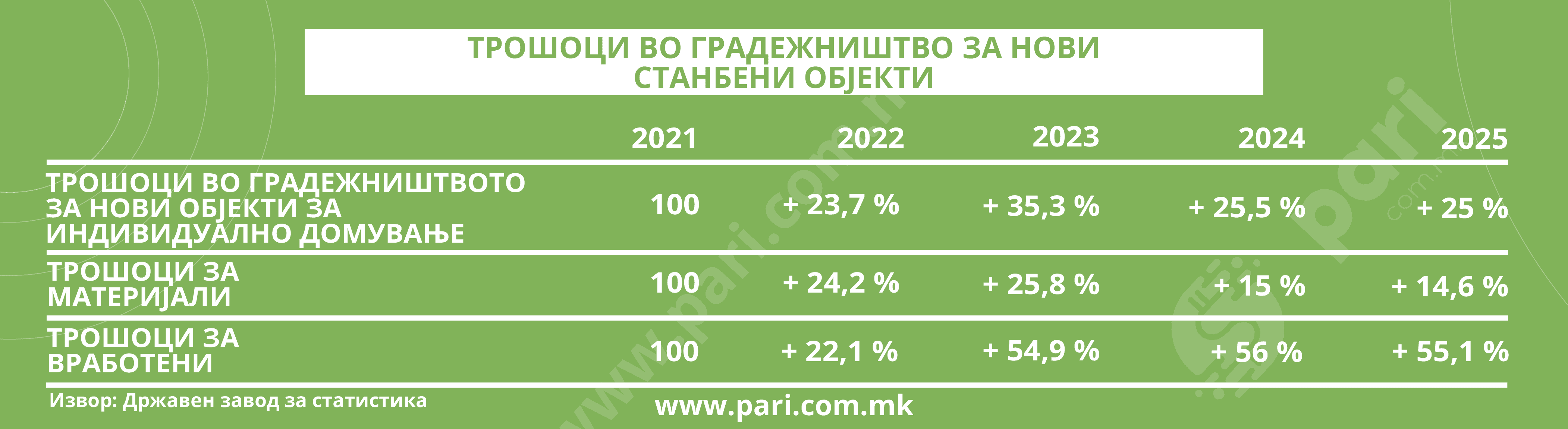 Државниот завод за статистика ја дава 2021 година како стартна, со индекс со база 100. Како што видовме и од податоците од Народната банка, оттогаш тргна и големиот раст на цените на становите. Според пресметките на статистичарите, во 2025 година во однос на 2021 година трошоците во градежништвото за нови станбени објекти пораснале за 25 насто. Но, ако се погледаат годините наназад, јасно е дека има и пад на тие цени. Во овој период најголемиот раст е евидентиран во 2023 година, кога трошоците за градба на станови се зголемиле за 35,3 насто во однос на 2021 година.
