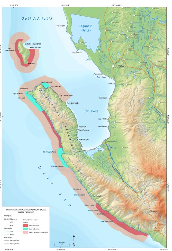 Националниот морски парк Карабурун Сазан се наоѓа во јужна Албанија, на северниот и западниот брег на полуостровот Карабурун и околу островот Сазани, на јужниот крај на Јадранското Море и северната граница на Јонското Море. Паркот е единствениот национален морски парк во Албанија, прогласен во април 2010 година. Овој парк се протега по должината на крајбрежјето на полуостровот Карабурун и островот Сазан во близина на Валонскиот Залив и опфаќа морска област што се протега 1 милја по должината на крајбрежјето. Морскиот парк зафаќа вкупна површина од 12.437,7 хектари. Сазан е најголемиот остров во земјата, со должина од 4,8 км , ширина од 2,7 км и површина од 5,7 км2. Опкружен е со Јадранското Море на север и Јонското Море на југ. Копнениот дел од островот е воена зона, додека полуостровот Карабурун е исто така природен резерват.