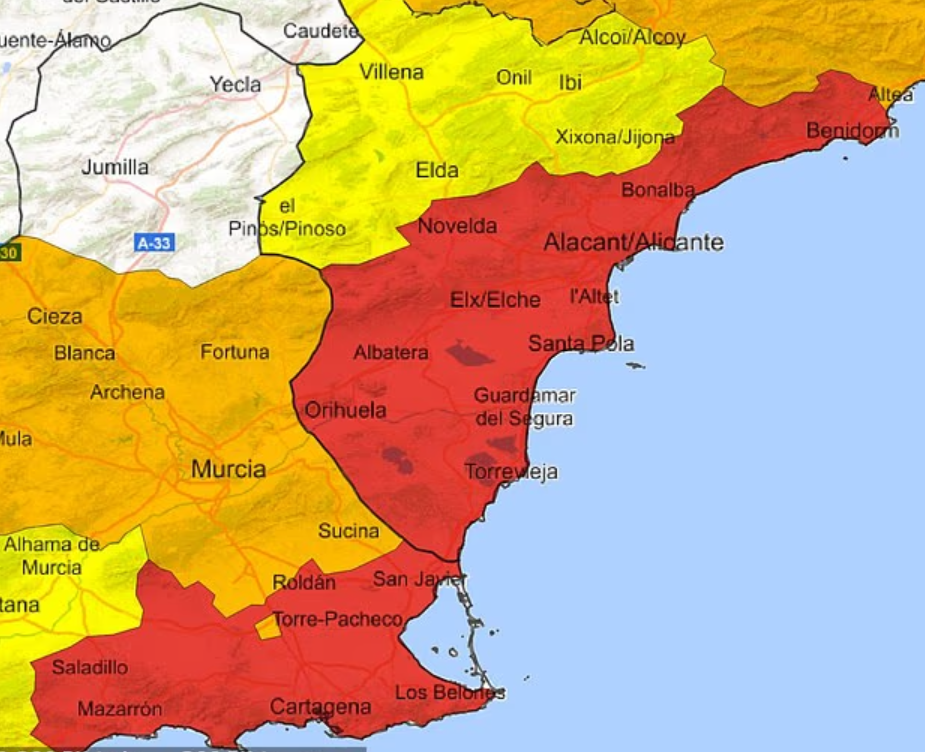 АЕМЕТ, шпанската метеоролошка агенција, издаде црвено предупредување за обилни дождови во одморалиштето Аликанте и рече дека ќе стапи на сила од петок наутро, но најлошото од бурата сè уште не е забележано. „Вонредна опасност. Можни се поплави и ненадејни поплави. Следете ги советите на цивилната заштита“, напиша агенцијата на X.