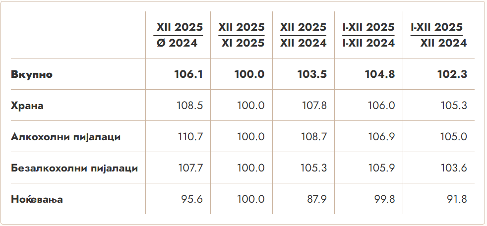 Во периодот јануари – декември 2025 година, во однос на истиот период од 2024 година, цените во угостителството се зголемени за 4,8 насто. Притоа, регистрирани се зголемувања од 6 насто кај храната, 6,9 насто кај алкохолните и 5,9 насто кај безалкохолните пијалаци.