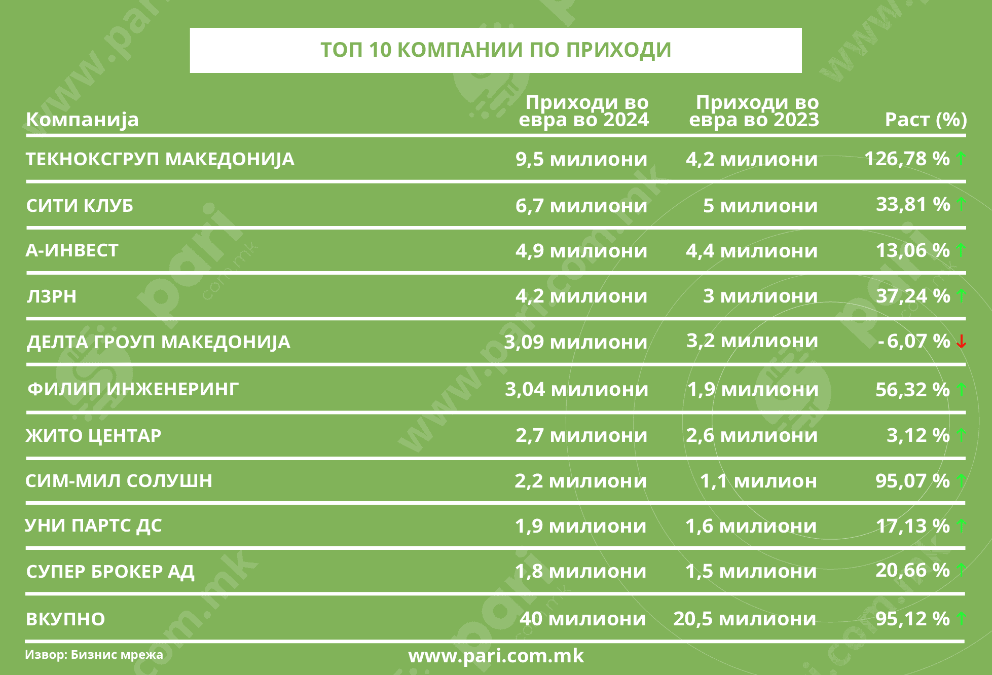 Лидер по приход во 2024 година е Текноксгруп Македонија, ексклузивен претставник на Caterpillar за Македонија. Со 9,5 милиони евра приход во 2024 година, оваа компанија бележи раст од 126,78 насто во однос на 2023 година, што ја позиционира како еден од двигателите на локалната економија.