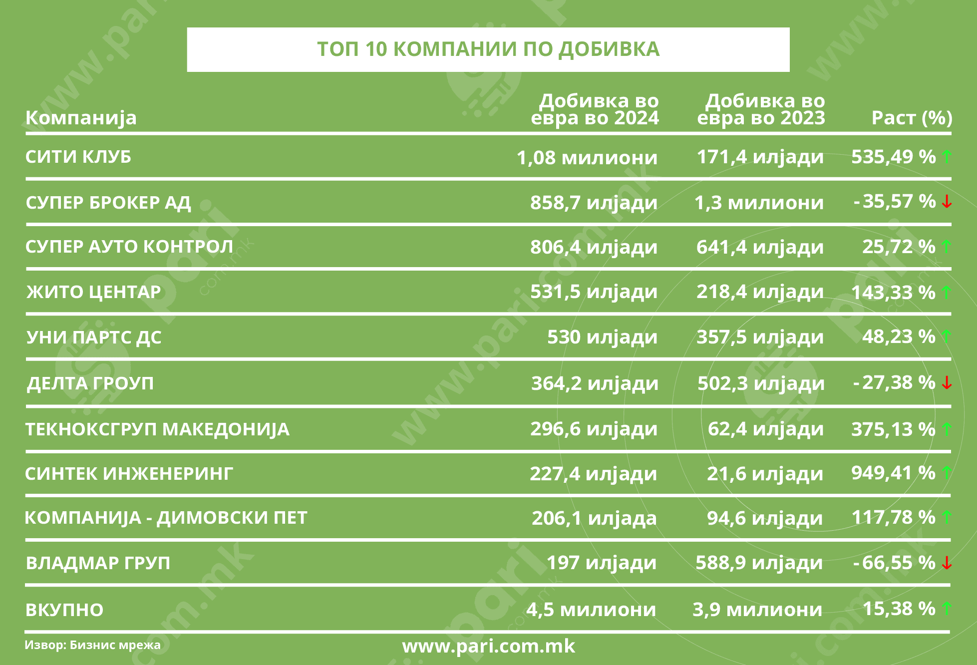 Ако приходот го покажува обемот на работа, добивката кажува кој знае да управува со пари. Во 2024 година, најпрофитабилна компанија во Чучер Сандево е Сити Клуб, со 1,08 милиони евра добивка, што е пораст од неверојатни 535 насто. Оваа фирма не само што остварува висок обем, туку има и одлична маржа.