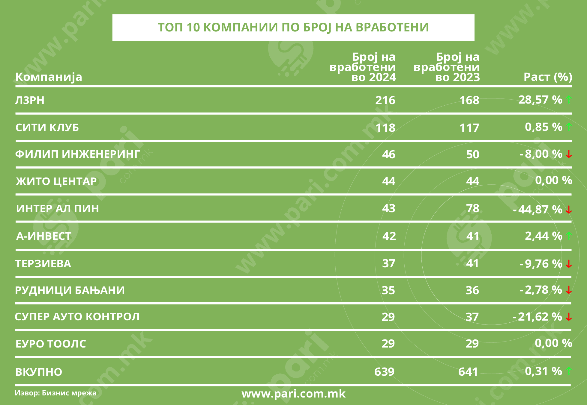 Сепак, кај Интер Ал Пин се забележува најголем пад ‒ од 78 на 43 вработени, што е намалување од 44,87 насто.