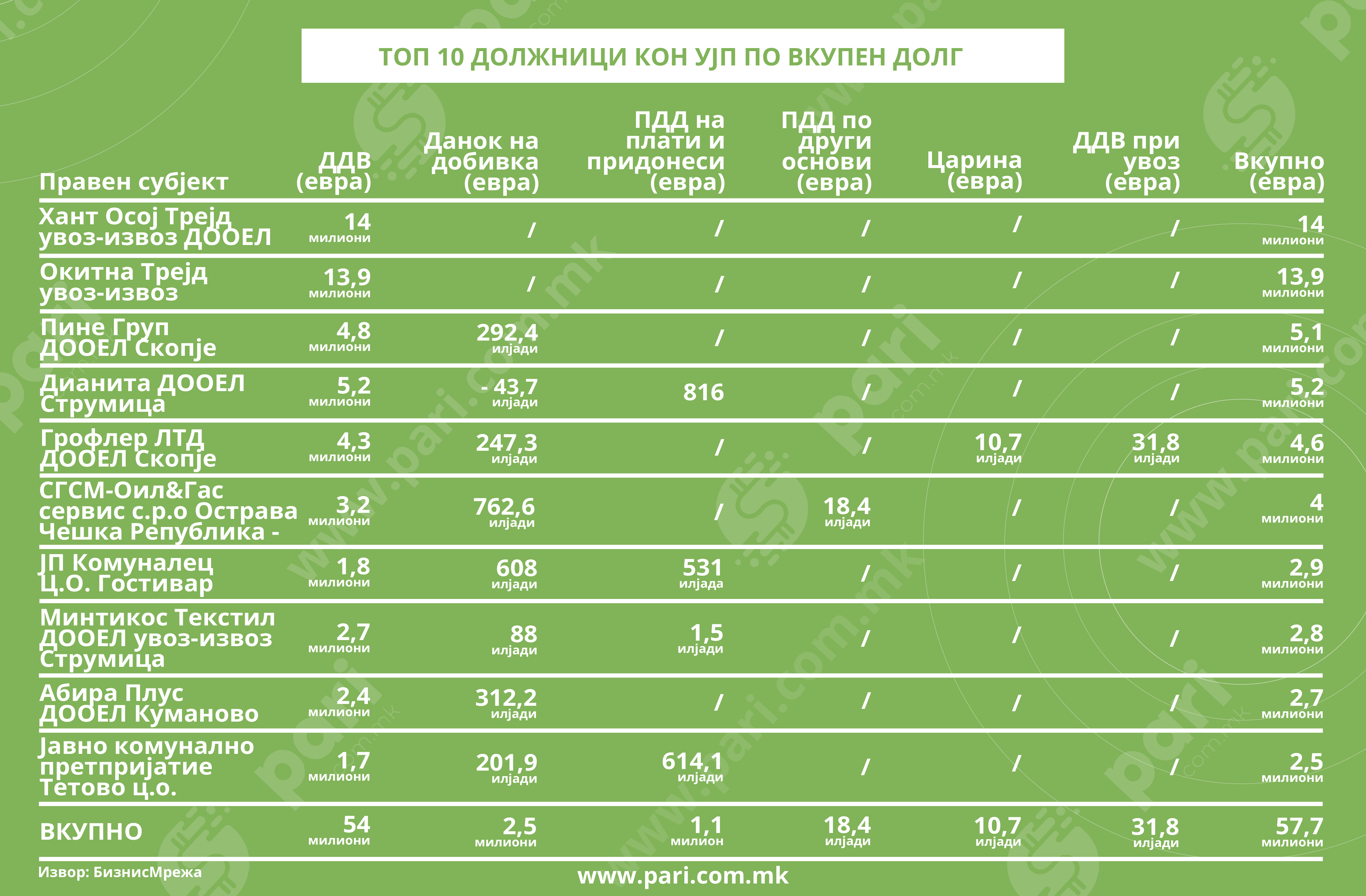 Најголемиот товар го носат десет компании, а меѓу нив се и две јавни претпријатија. Долговите се концентрирани и по географска линија и по вид данок. Од анализата што Пари ја направи во соработка со Бизнис Мрежа произлегоа две високи бројки. Десетте најголеми должници треба да платат вкупно 57,7 милиони евра. Износот од десетте градови каде што се лоцира најголема задолженост кон УЈП е 170,5 милиони евра.