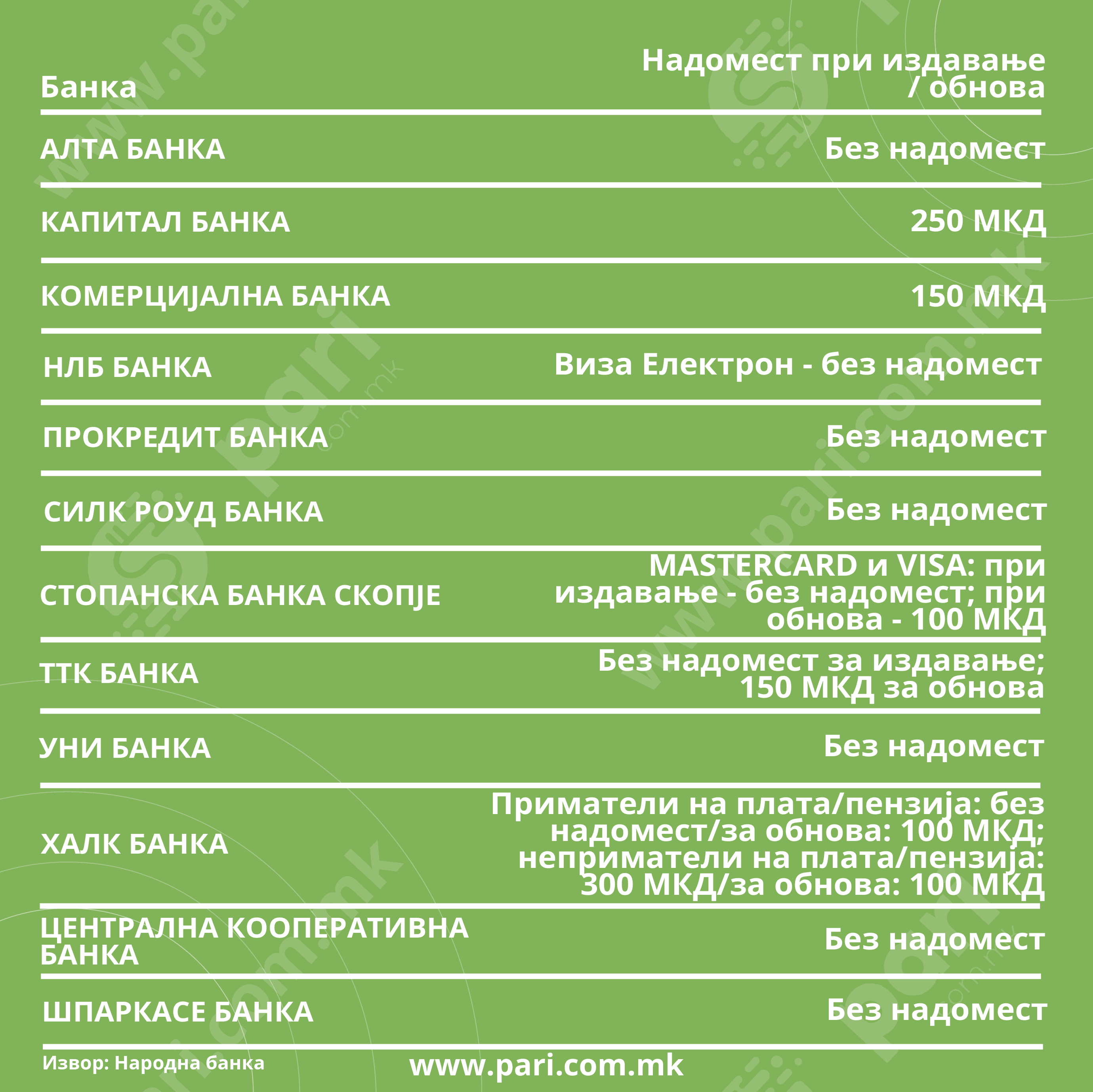Стопанска банка Скопје и ТТК банка не наплатуваат провизии за издавање, но обновата чини 100, односно 150 денари.