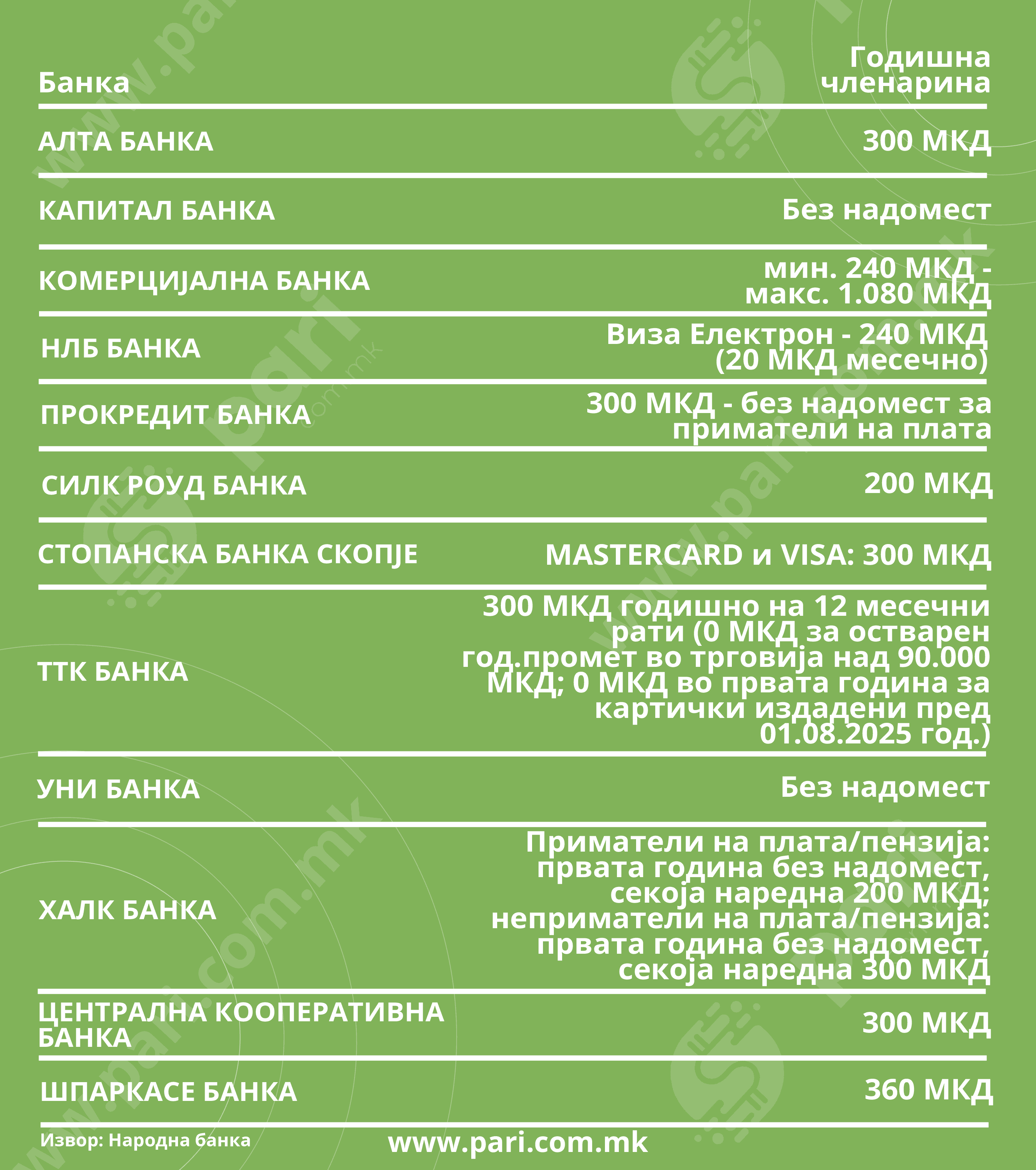 Алта банка, ПроКредит банка (за неприматели на плата), Стопанска банка Скопје, ТТК банка и ЦКБ имаат годишен надомест од 300 денари.