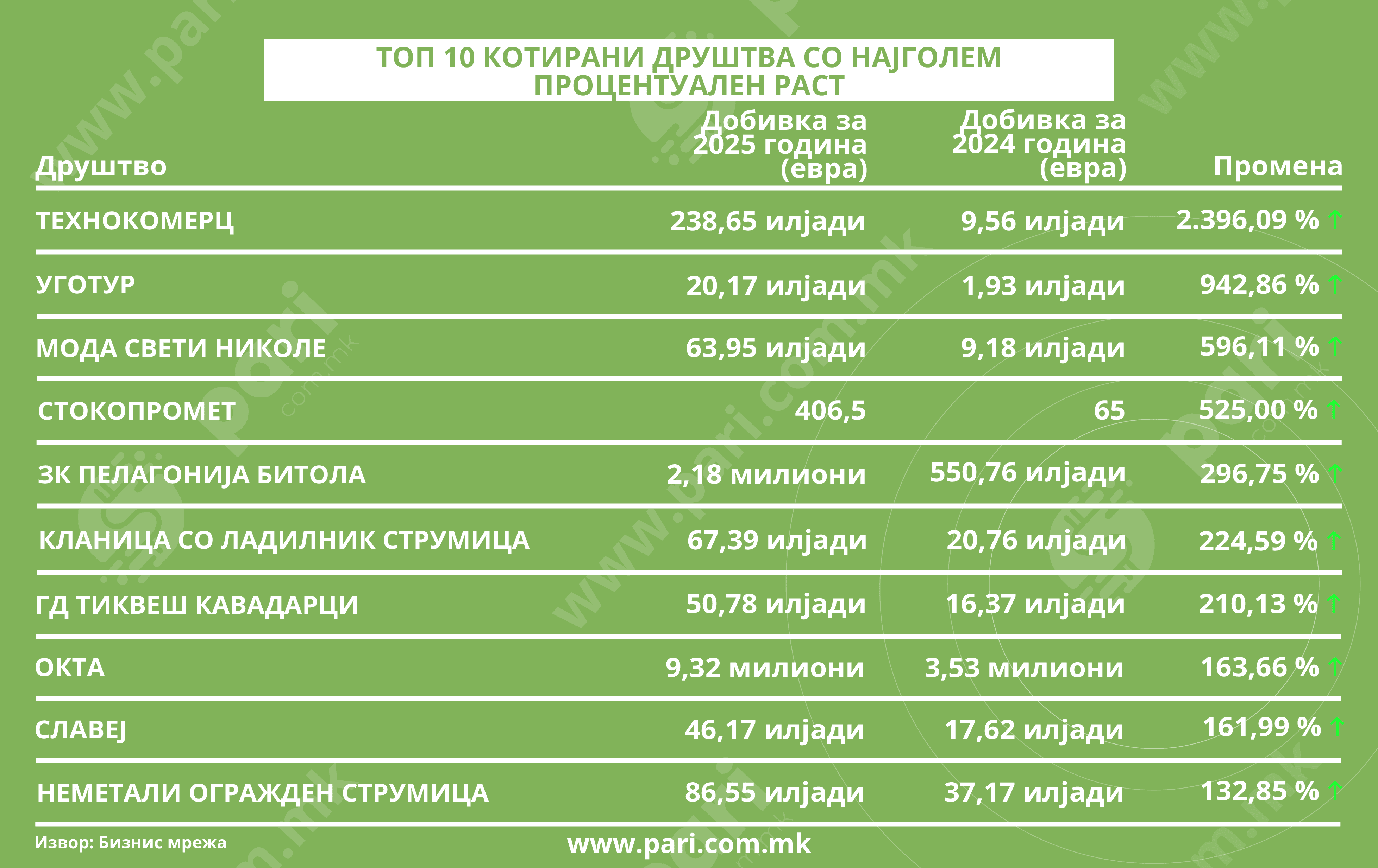 Најимпресивен е растот на скопски Технокомерц – од 2.396,09 насто. Во апсолутен износ, тоа значи исчекор од 9,5 илјади (2024) на 238,6 илјади во 2025 година.