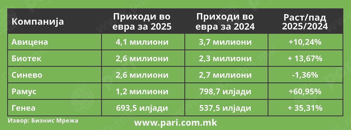 На врвот според остварен приход е Авицена, со 4,1 милион евра, што претставува зголемување од 10,24 насто во однос на 2024 година, кога приходот изнесувал 3,7 милиони евра.
