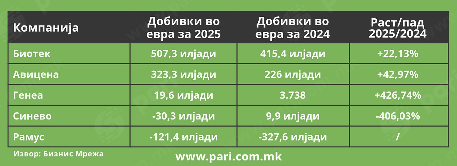 Најголема добивка во 2025 година оствари Биотек, со 507,3 илјади евра, што претставува раст од 22,13 насто во однос на 2024 година.
