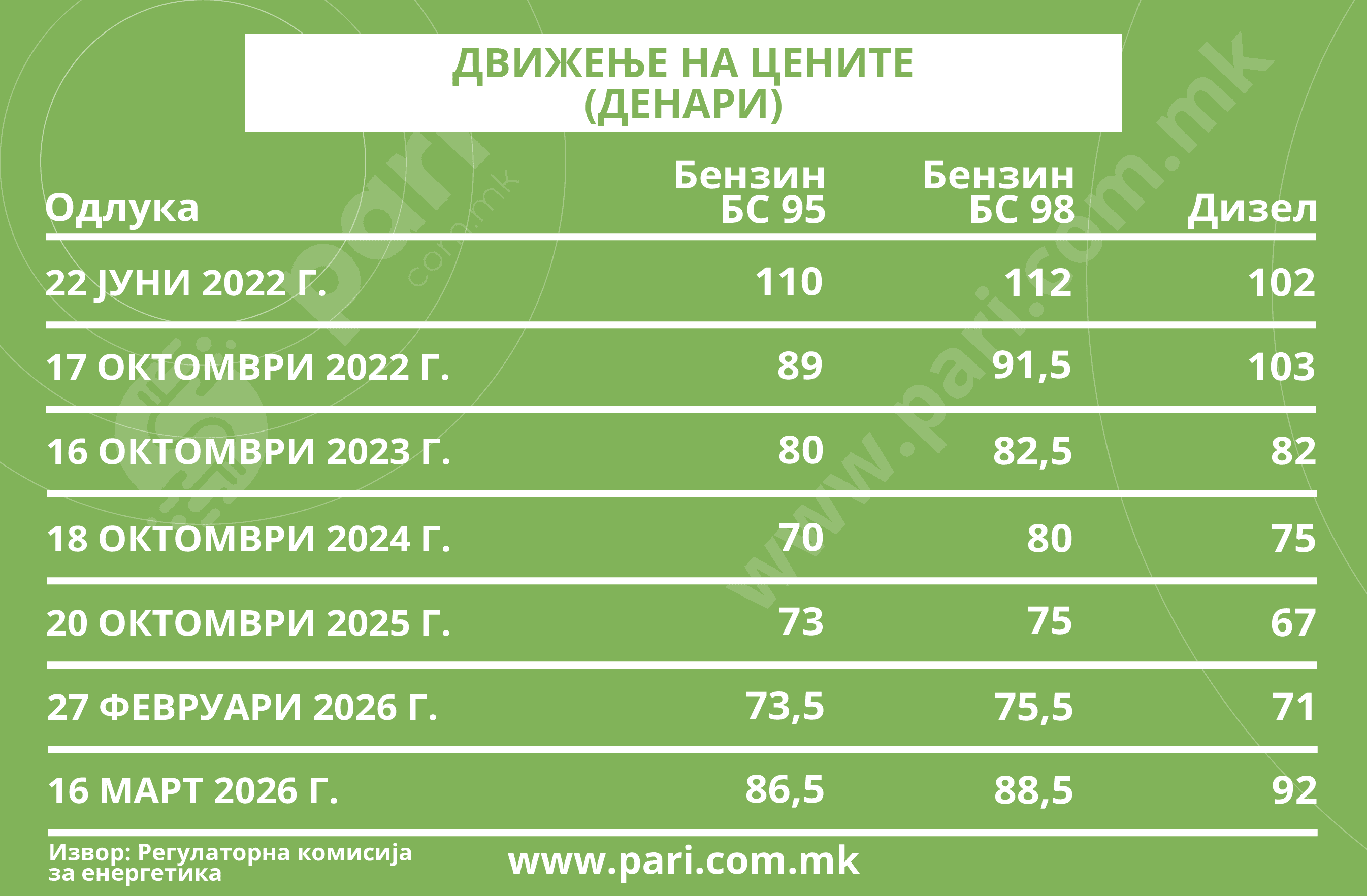 Од Регулаторната комисија за енергетика стигна ново поскапување на горивата. Од вторник, во 00:01 часот, цената на бензините се зголеми за 7 денари, а на дизелот за 6,5 денари по литар во однос на цената утврдена со одлуката од 09.03.2026 година. Новата цена на еуросупер БС 95 изнесува 86,5 денари за литар, а малопродажната цена на еуросупер БС 98 изнесува 88,5 денари за литар. Дизелот стигна до 92 денари.