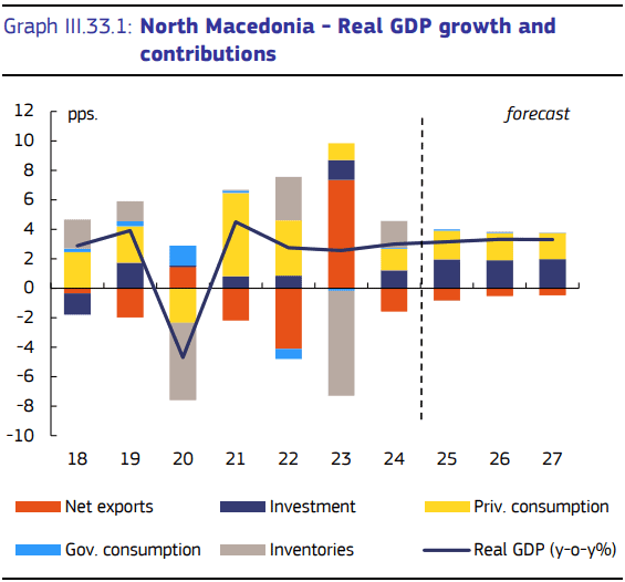 „Бруто-инвестициите ќе го имаат главниот придонес кон растот. Јавните градежни работи на коридорите 8 и 10д започнаа во 2025 година, а нивниот максимален придонес врз растот се очекува во 2027 година. Приватните инвестиции имаат корист од подобрените деловни очекувања и субвенционираното финансирање преку кредитните линии од Унгарија и ЕИБ. Иако растот на извозот се очекува да забави по силниот прв квартал, а увозот да расте за да ја задоволи домашната побарувачка, негативното влијание на надворешната рамнотежа врз растот ќе се намалува“.