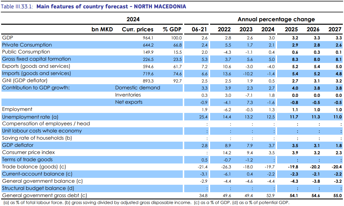 Во првата половина од годинава БДП забележа годишен раст од 3,2 насто, поттикнат од домашната побарувачка. Се проектира растот дополнително да забрзува во текот на наредните две години, пред сè воден од инвестициите и приватната потрошувачка, се вели во Есенската економска прогноза 2025 на Европската комисија. И, се напоменува дека во земјава инфлaцијата и натаму се зголемува, и тоа како резултат на домашните фактори – растот на платите и на кредитирањето. Исто така, се смета дека плановите за фискална консолидација се неизвесни, затоа што поради околностите, предизвик е исполнувањето на целта за дефицит од 3 проценти од БДП. Сепак, се очекува дефицитот постепено да се намалува, но да остане над тоа ниво.