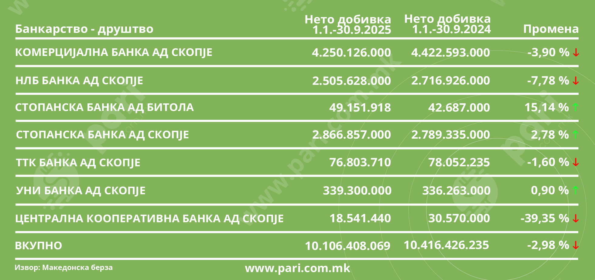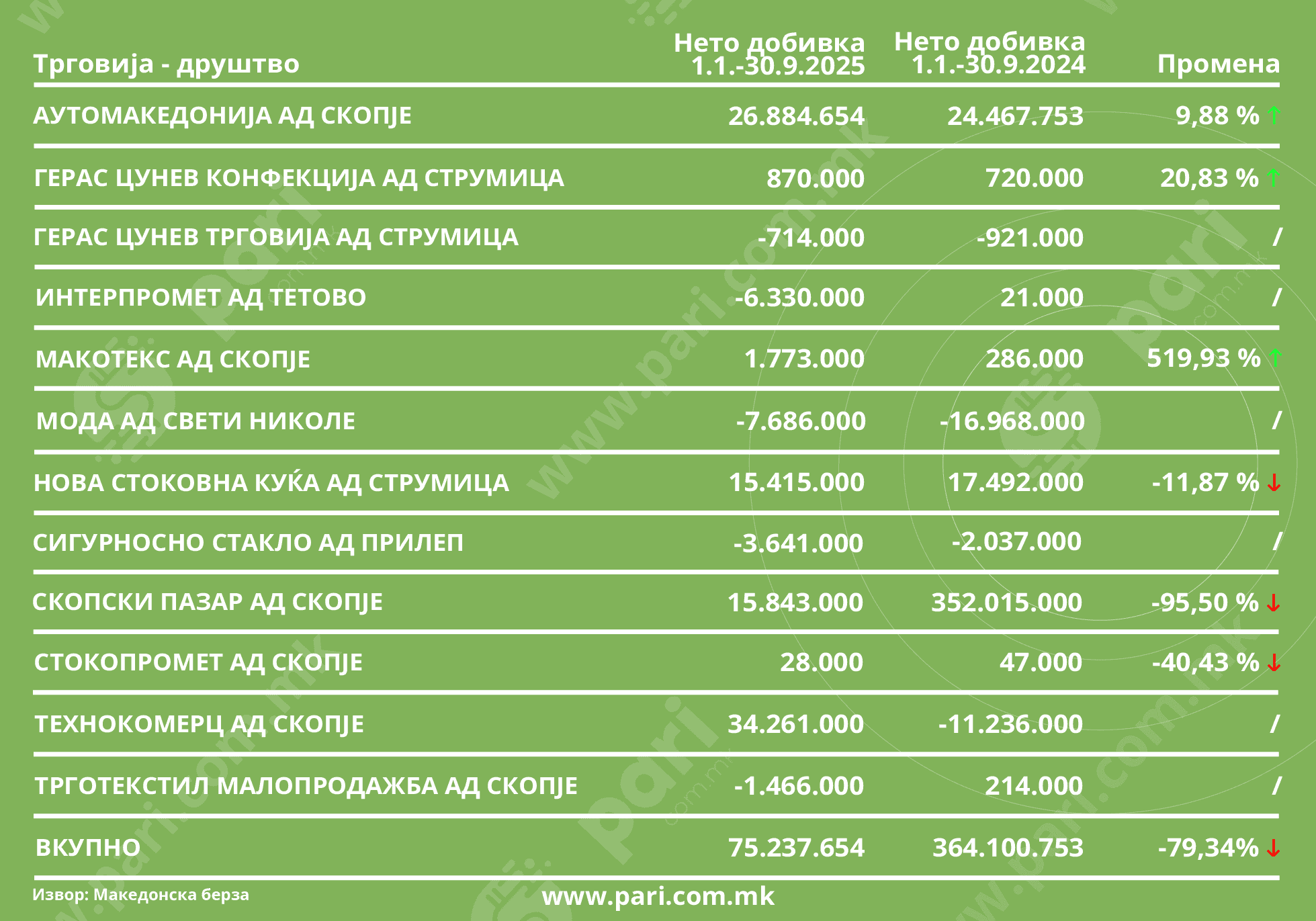 Вкупната добивка на компаниите котирани на Македонска берза за одработените девет месеци од годинава изнесува 19,19 милијарди денари или приближно 311,9 милиони евра, што е за 2,98 насто повеќе во однос на истиот лански период. Во тоа заедничко постигнување профитот има удел од 19,82 милијарди денари, проследен со раст од 2,46 насто, додека загубите се  намалени на 630,4 милиони денари, за разлика од регистрираните во 2024 година – 709,3 милиони денари.