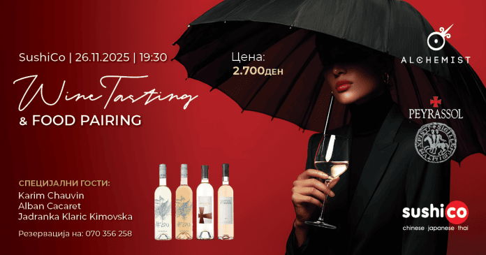 Под внимателна организација на Alchemist MK, официјален увозник на вината Peyrassol во Македонија, гостите ќе имаат можност да вкусат четири одбрани вина од реномираната француска винарија, совршено споени со гурмански јадења подготвени од мајсторите на кујната на SushiCo.