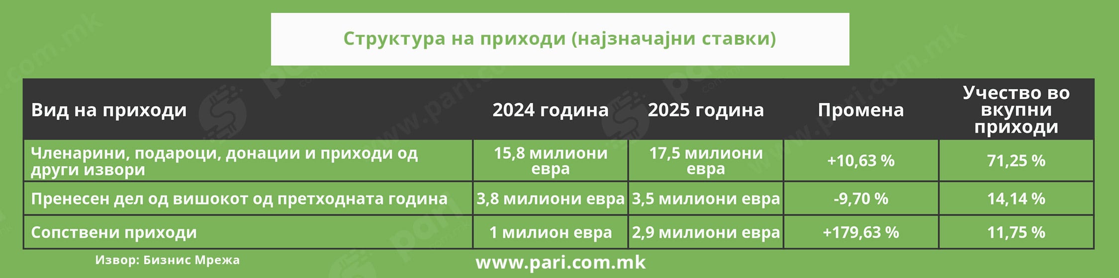 Во 2025 година, на сметката на ФФМ се слеале 24,6 милиони евра. Тоа е за речиси 4 милиони или за 17,95 насто повеќе во однос на претходната година. Истовремено, ефикасноста во трошењето резултирала со раст од 29,66 насто и во ставката вкупни расходи е запишан износ од 22,5 милиони евра. Со текот на времето, како што може да се види од анализата на Пари, просторот меѓу приходите и расходите се намалува т.е. финансиската резерва се стеснува од 4,3 милиони (2022 година) на ланските 2,1 милион евра.