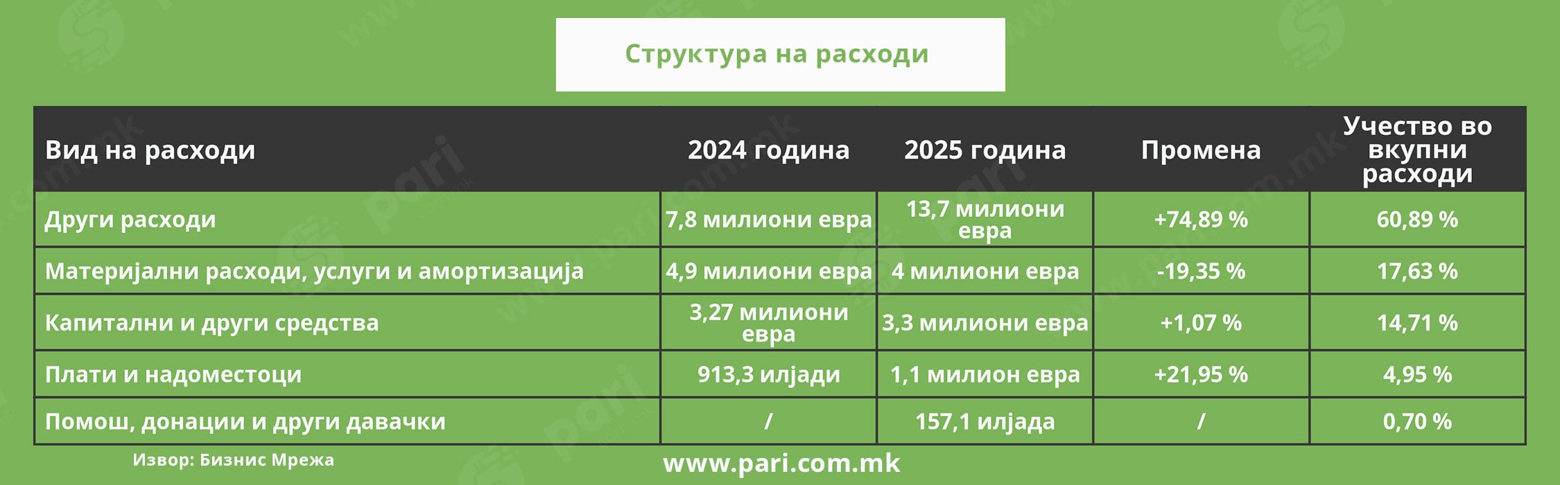 Во случајот со ФФМ, материјалните расходи и услугите опаѓаат, а платите учествуваат со помалку од 5 насто во вкупните расходи. Или, тимот се зголемува, но тоа не се рефлектира драстично во обемот на трошоците. Конкретно, лани во Фудбалската федерација работеле 70 лица (а имало 58 вработени во 2024 година). Таа промена ги зголемила вкупните издатоци за плати заедно со поврзаните надоместоци за безмалку 22 насто, од 913,3 илјади на 1,1 милион евра.