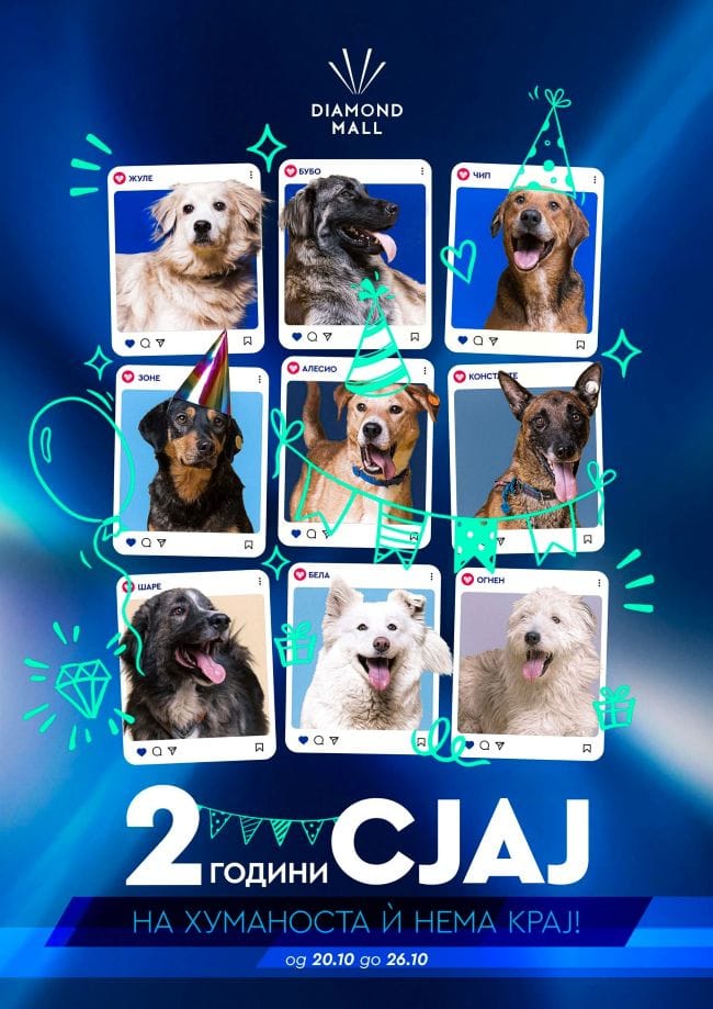 Diamond Mall ја започна својата роденденска прослава со повик до граѓаните на заедничка хумана мисија, посветена на грижа за напуштените животни и поттикнување на нивно вдомување. Наместо класична прослава, Diamond Mall преку низа активности сака да ја подигне свесноста за грижата за бездомните животни и да ги поттикне граѓаните повеќе да вдомуваат улични кучиња.