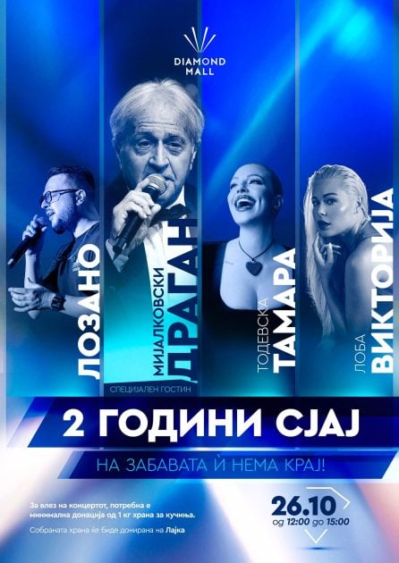 На 26 октомври ќе се случи големиот хуманитарен концерт во атриумот на Diamond Mall, а ќе настапат популарни пејачи Тамара Тодевска, Лозано, Викторија Лоба, кои се познати и по грижата за животните. Специјален гостин ќе биде музичката легенда Драган Мијалковски. Влезот ќе биде бесплатен, а единствен услов, во духот на целиот настан, ќе биде да се донесе минимум еден килограм храна за кучиња, која потоа ќе ѝ биде донирана на „Лајка“, која е партнер на Diamond Mall во реализација на овој хуманитарен настан. Во 14.00 часот ќе бидат објавени добитниците од роденденската наградна игра, по што концертот продолжува.