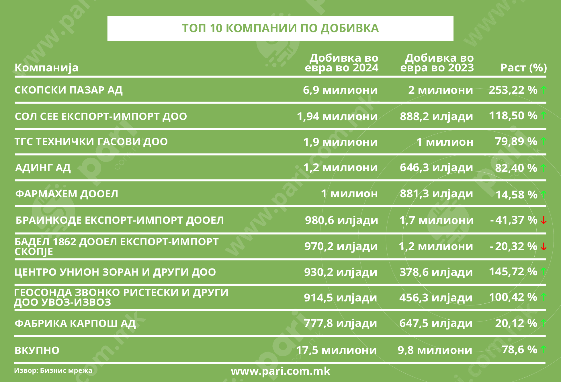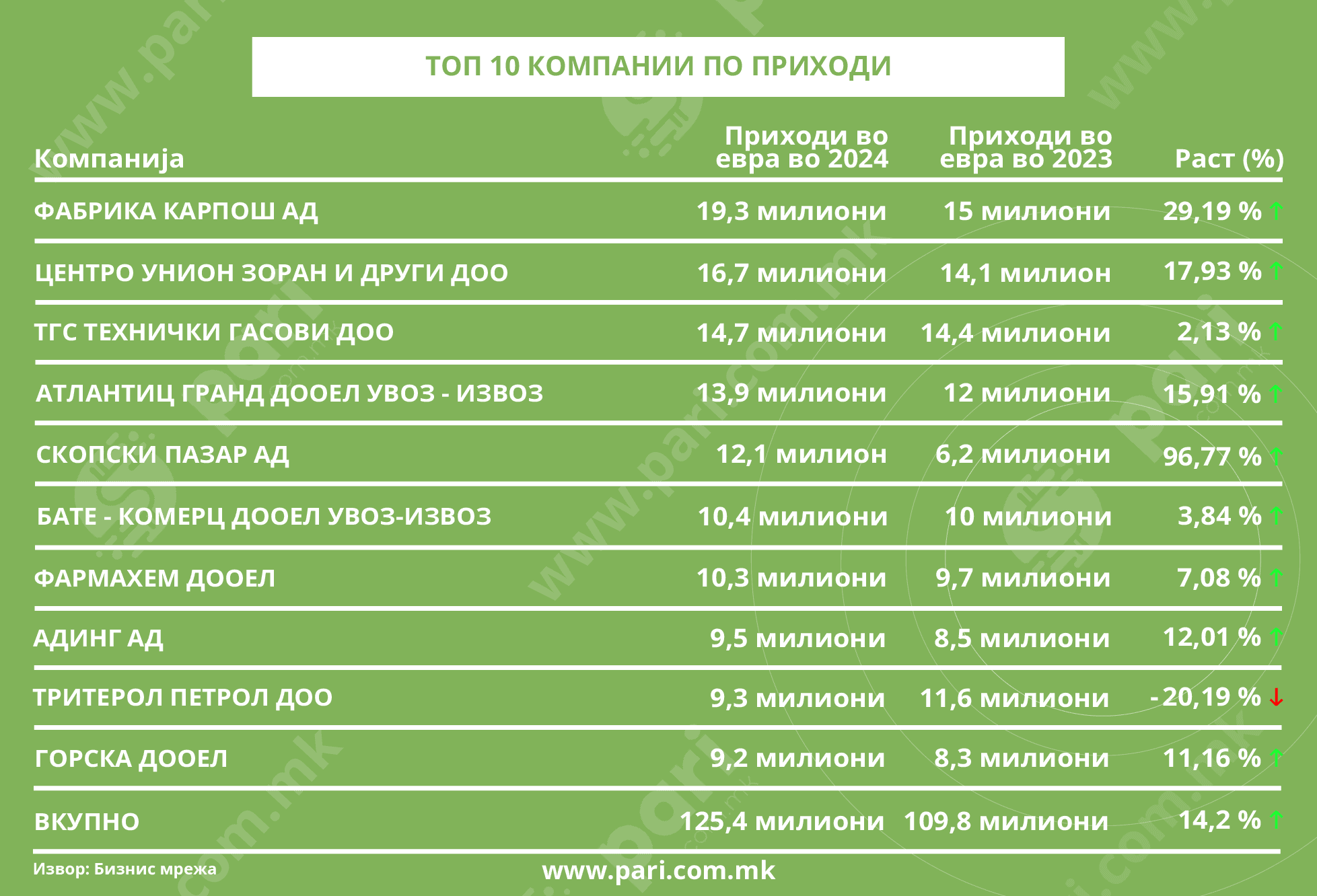 Сликата за успешноста на бизнисите се добива од анализата што порталот Пари, во соработка со Бизнис Мрежа, ја направи за работењето на најдобрите компании во 2024 година. Резултатите се солидни. Десетте компании со највисоки приходи имаат заедничко остварување од 125,4 милиони евра, што претставува раст од 14,2 насто во однос на 2023 година. Десетте најпрофитабилни фирми ја зголемиле добивката за 78,6 насто достигнувајќи 17,5 милиони евра. Десетте најголеми работодавачи обезбедуваат плата за 1.290 лица.