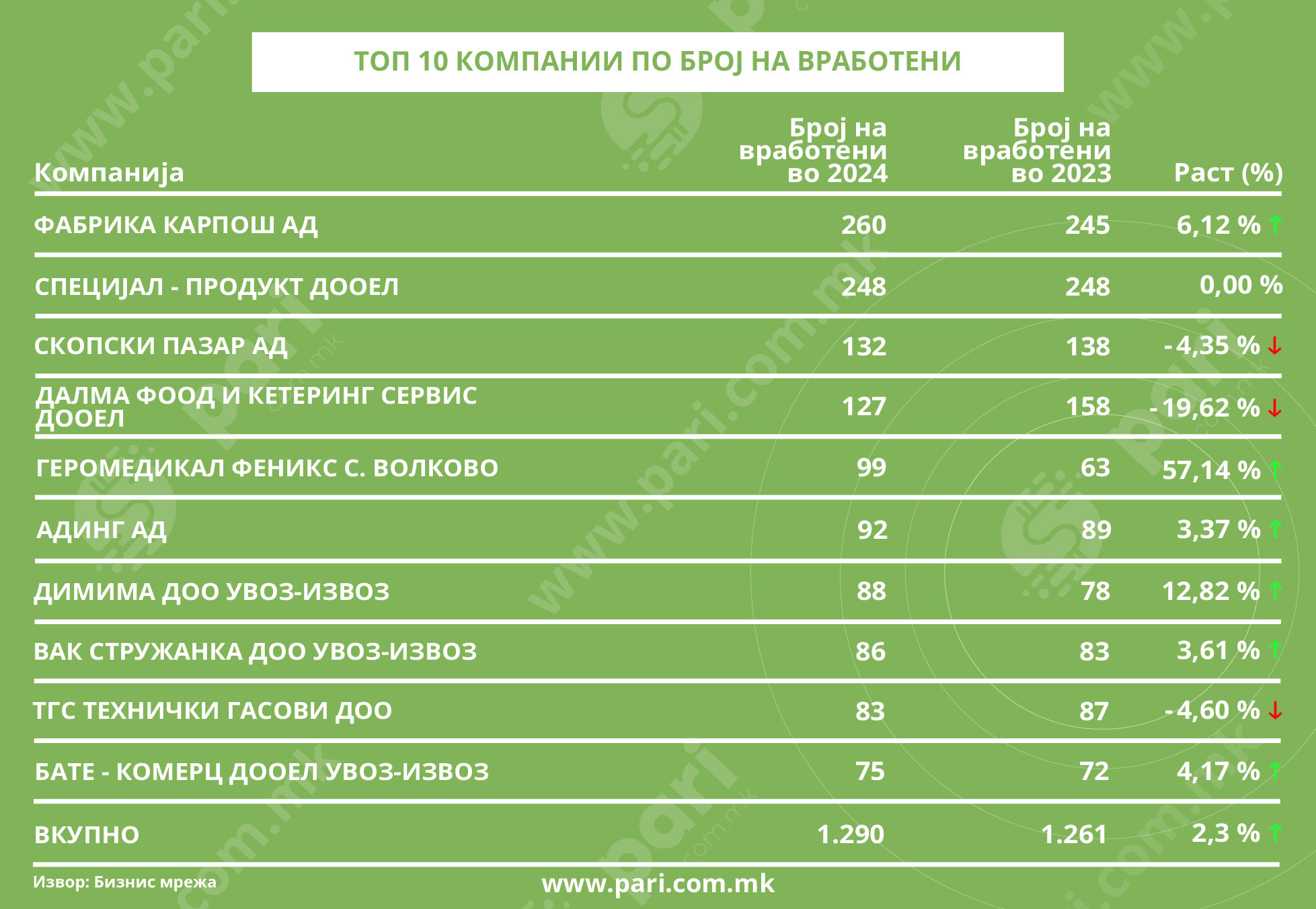 Што се однесува до вработените, десетте најголеми компании во Општината ангажираат 1.290 лица. Тоа е за 2,3 насто повеќе споредено со бројната состојба од 2023 година. Најголем работодавач е Фабрика Карпош АД со 260 лица. Со дополнително пополнетите 15 работни места (+ 6,12 %) лани избиле пред Специјал – Продукт. Во пекарско-слаткарската фирма, чие производство се одвива во седум пекарници, лани немало промени во екипираноста (248).