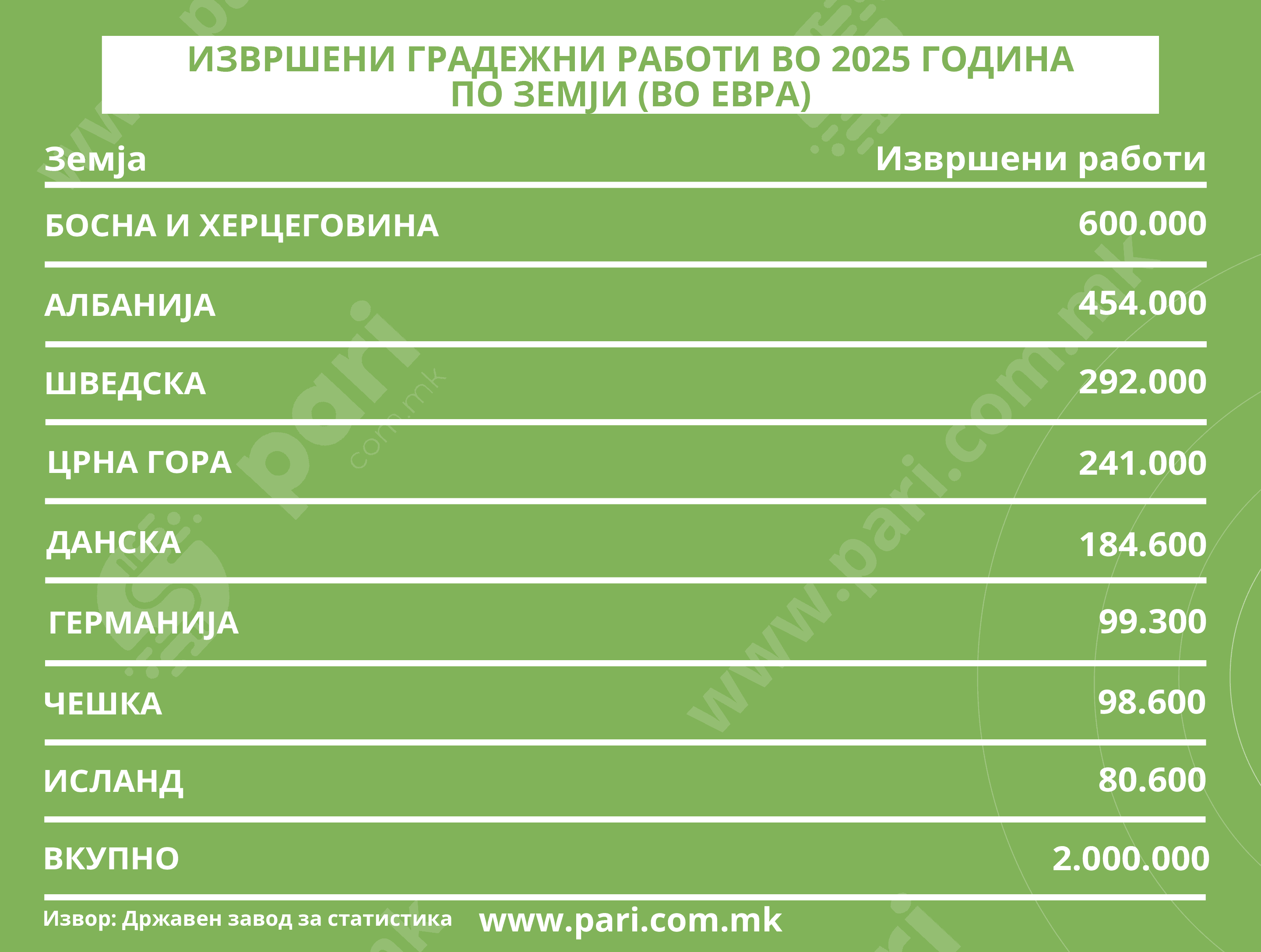 Порталот „Пари“ ги разгледа податоците од Држвниот завод за статистика и дојде до сознание дека во 2015 година вредноста на извршените градежни работи во странство изнесувала 48,3 милиони евра, за разлика од минатогодишните 2 милиони. Податоците покажуваат нагол пресврт во 2019 година, кога од 20,8 милиони евра во претходната година се извршени градежни работи за само 4,5 милиони. Во 2020 година продолжува големиот тренд на намалување на градежните активности во странство. Бројката речиси се преполовува – тогаш нашите компании создале градежна вредност од 2,4 милиони евра. Но, никогаш немало толку мал обем на реализирана вредност како минатата година!