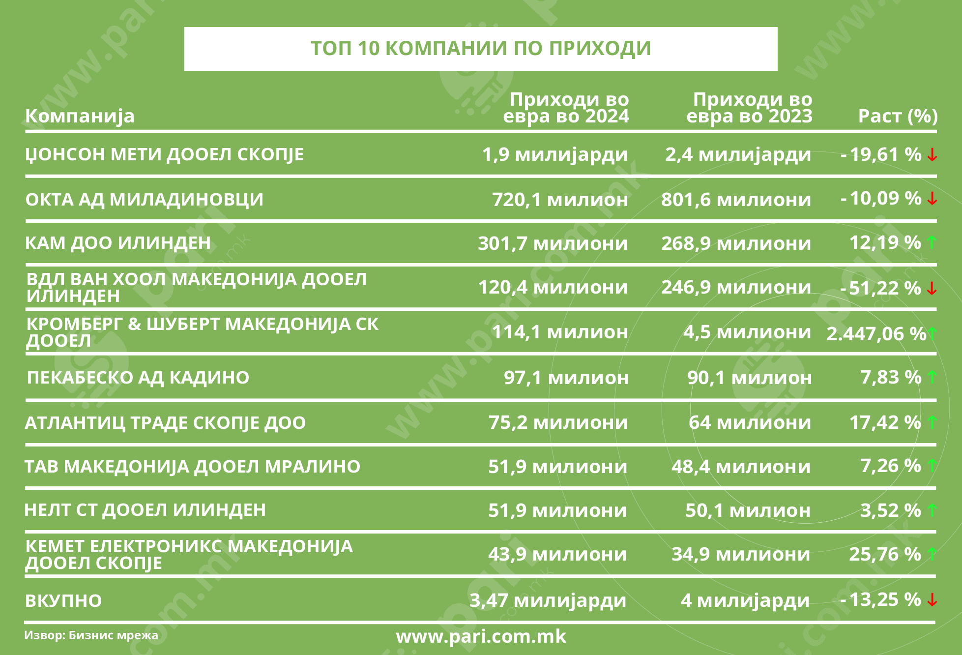 Најголемите компании со адреса во оваа општина, со своите разновидни дејности оствариле приход од 3,47 милијарди евра. Износот, кој во споредба со 2023 година е понизок за 13,25 насто, се однесува на топ 10 компаниите со најголеми приливи. Намалувањето е рефлексија на падот забележан кај три од нив. Но, и покрај тоа, рангирани се на првите четири позиции.