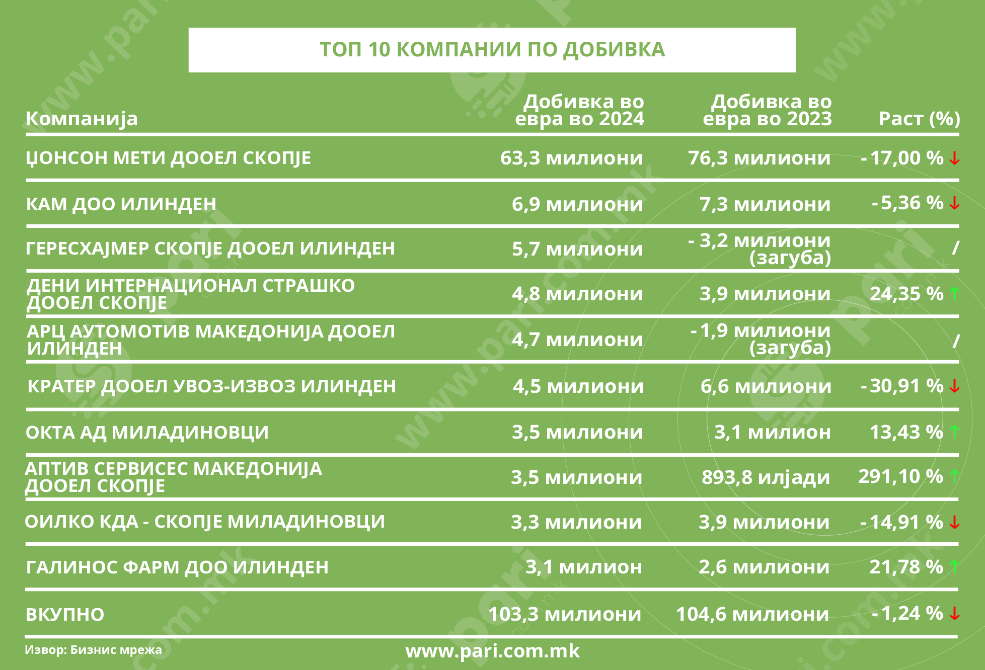 Вкупниот резултат на десетте најпрофитни е 103,3 милиони евра. Годишната разлика не е голема, односно станува збор за намалување од 1,24 насто.