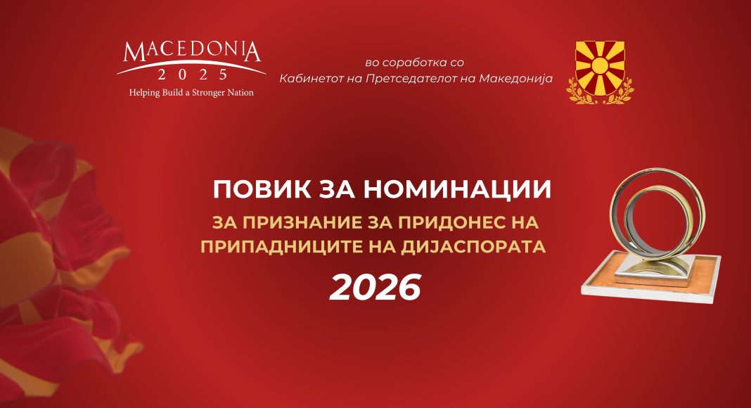 Македонија2025, во соработка со Кабинетот на Претседателот на Македонија, ги повикува граѓаните, институциите, организациите и сите релевантни чинители во земјата и странство активно да се вклучат во процесот на номинирање кандидати за Признанието за придонес на припадниците на дијаспората за 2026 година.