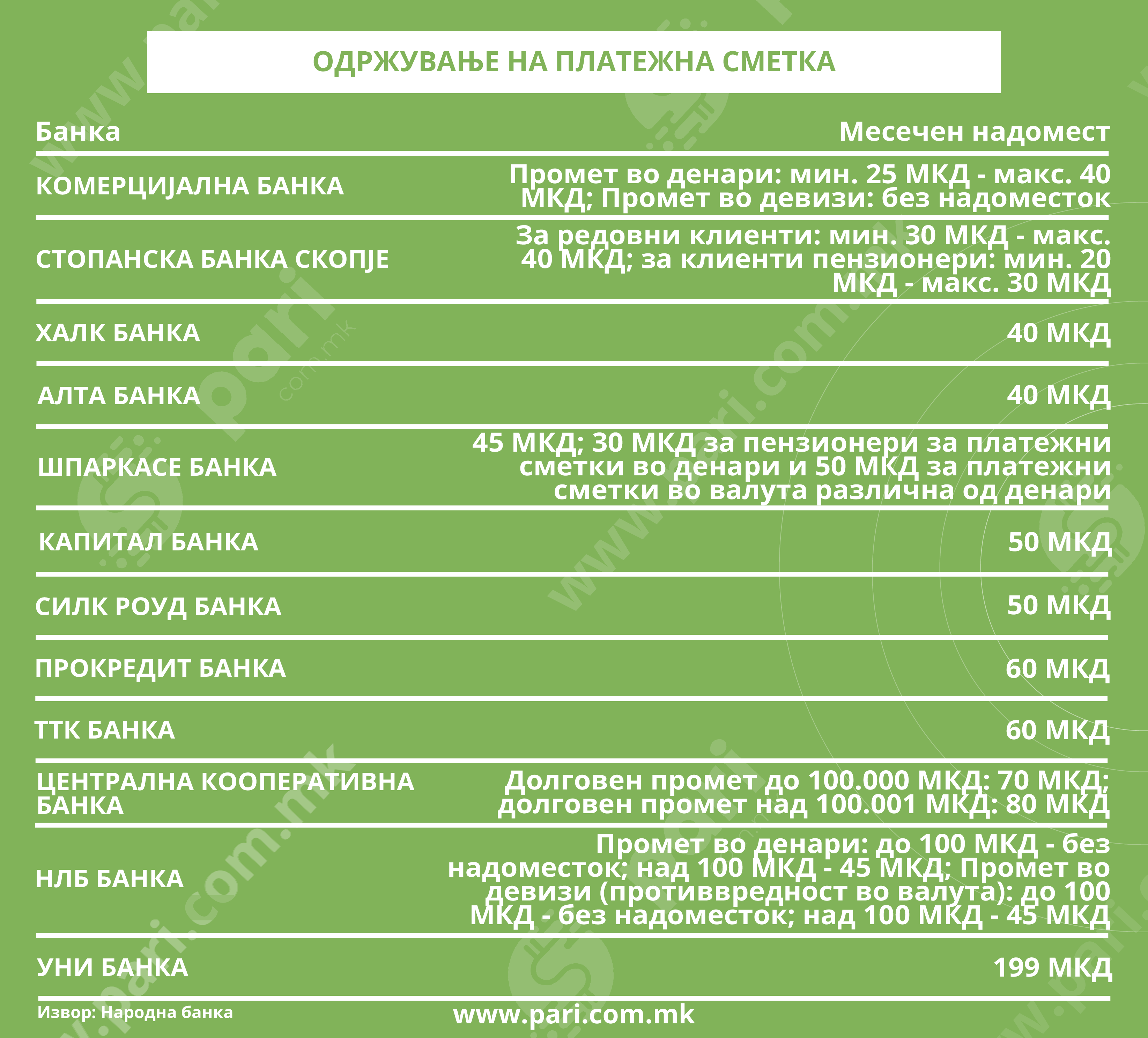 Надоместоците за одржување на платежна сметка кај банките во земјава се движат во широк распон, зависно од видот на клиентот и обемот на трансакции. Дел од банките имаат фиксна месечна провизија, која се движи од 40 до 60 денари, додека кај некои износот зависи од месечниот промет или од статусот на клиентот – дали е редовен, пензионер или користи пакет-услуги. Кај одредени банки постојат и повисоки надоместоци за специфични типови сметки или за клиенти со поголем обем на трансакции.