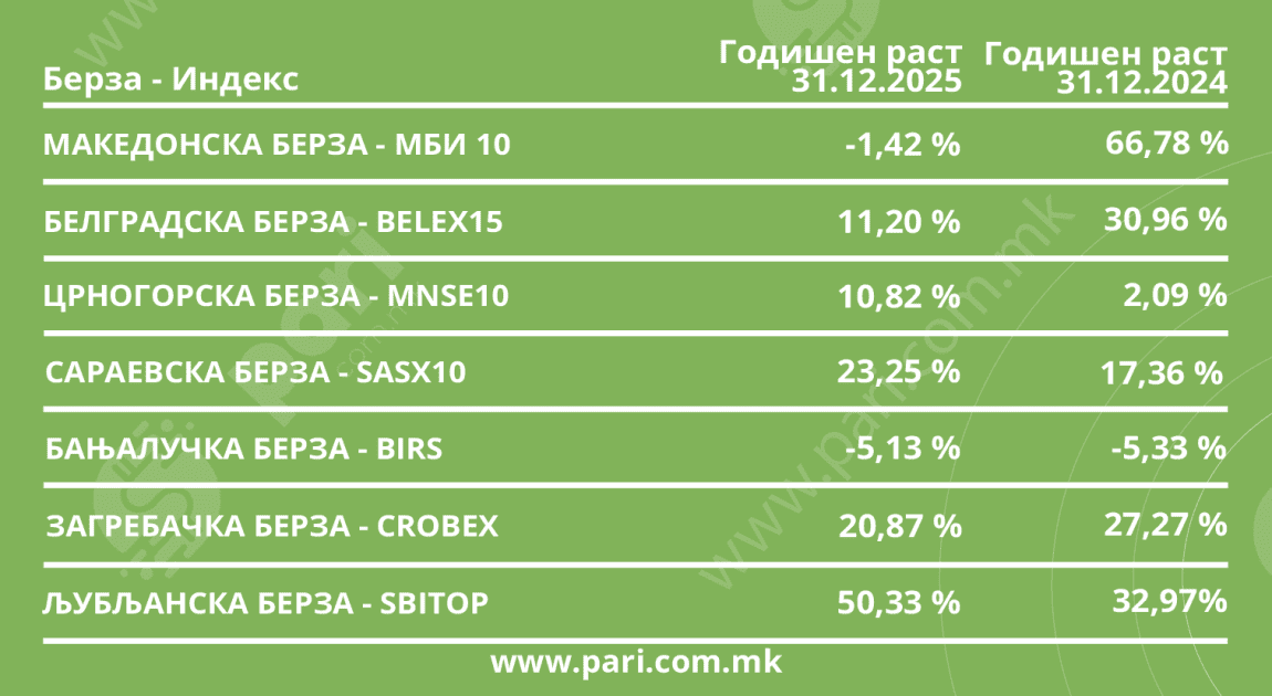 Дури и пазари, како Црногорската и Сараевската берза, кои се сметаат за помалку ликвидни или волатилни, успеаја да остварат позитивна динамика во минатата година. Единствен исклучок е Бањалучката берза, која и во 2024 и во 2025 останува во негативна зона.