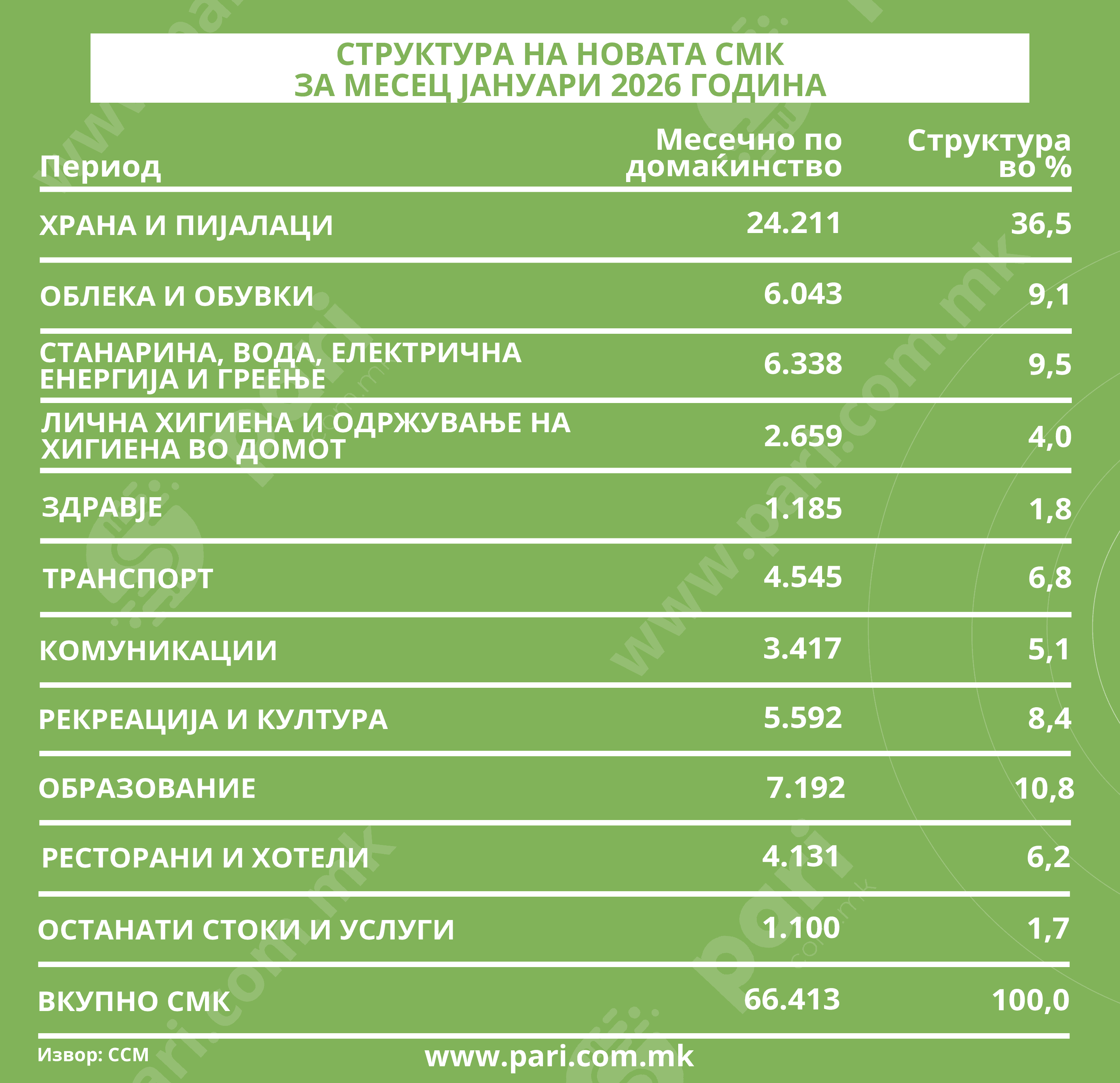 Најголемиот товар во семејниот буџет и понатаму е храната. Во јануари, трошоците за храна и пијалаци достигнале 24.211 денари, што претставува 36,6 проценти од вкупната кошница. Оваа сума е зголемена за 571 денар во однос на декември и речиси целосно се поклопува со минималната плата од 24.397 денари. Тоа значи дека една минимална плата практично оди само за храна без струја, без кирија, без превоз.
