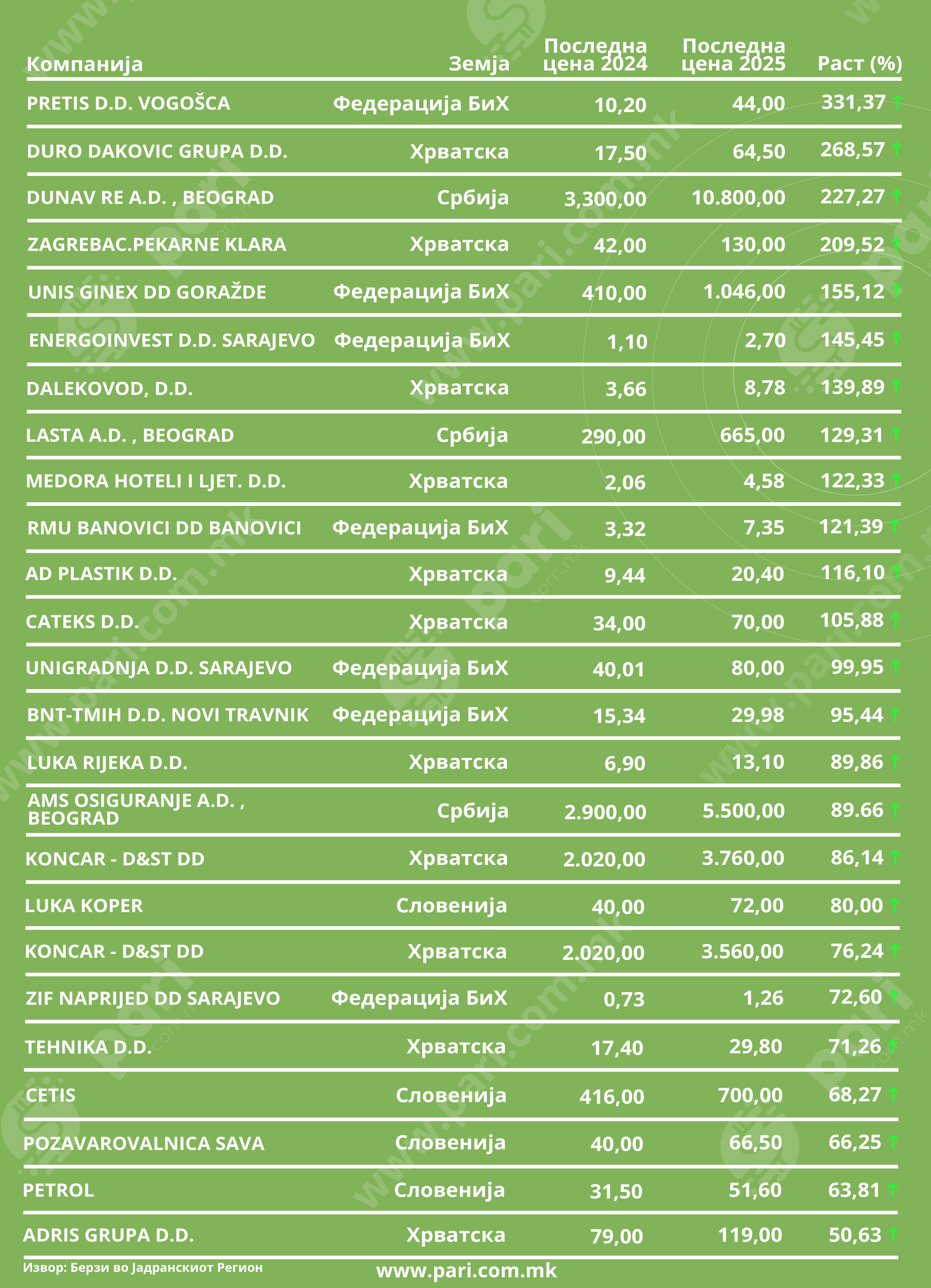 Меѓу компаниите од Јадранскиот Регион чии акции остварија ценовен раст поголем од 50 насто нема македонски компании. На Македонската берза во 2025 година доминираше надолен тренд, така што само 14 акции остварија годишен раст на цената. Меѓу нив, на прво место е акцијата на ВВ Тиквеш со раст од 48,02 насто.