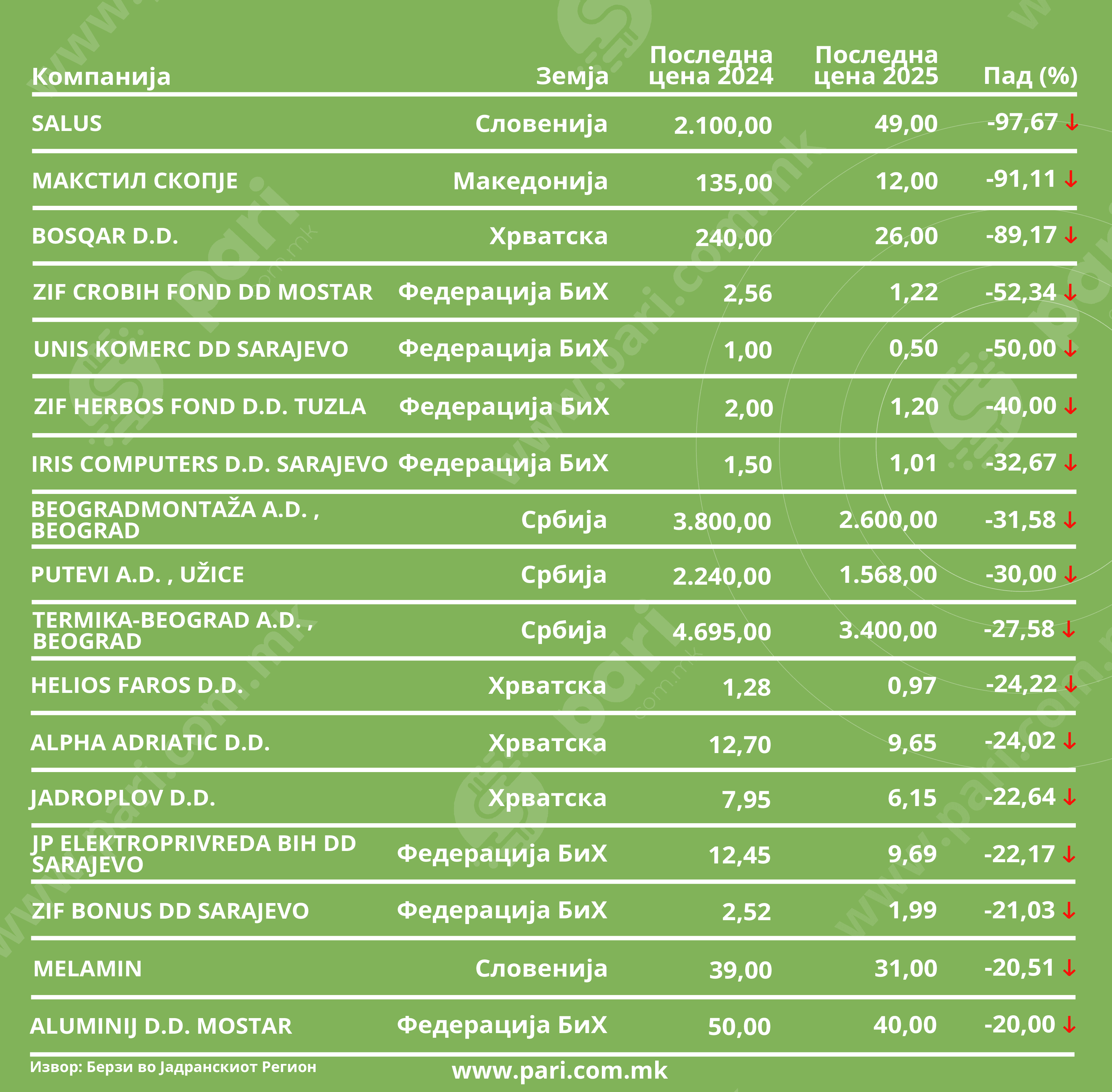 Но, како што секоја берзанска година има победници, така има и губитници, кои ги оставија инвеститорите разочарани. Најголемиот пад го доживеа акцијата на компанијата Salus од Словенија, чија вредност се стопи за драматични 98 насто, пад што ретко се гледа и сигурно не се посакува на берзите. Тоа ја направи да биде едно од најголемите разочарувања за инвеститорите во Јадранскиот Регион. Оваа компанија врши големопродажба и дистрибуција на фармацевтски и медицински производи и не е активна само во Словенија, туку и на пазарите во Централна и Источна Европа. Во 2025 година го заврши купувањето на Farmadent, словенечка фирма за фармацевтски производи и опрема, што е дел од нејзината стратегија за зајакнување на позицијата на пазарот на Југоисточна Европа. Според деловни извештаи, Salus цели на нето-добивка од околу 15,5 милиони евра во 2026 година, што покажува амбиција за стабилен раст и повратно закрепнување по пазарните падови од 2025 година.
