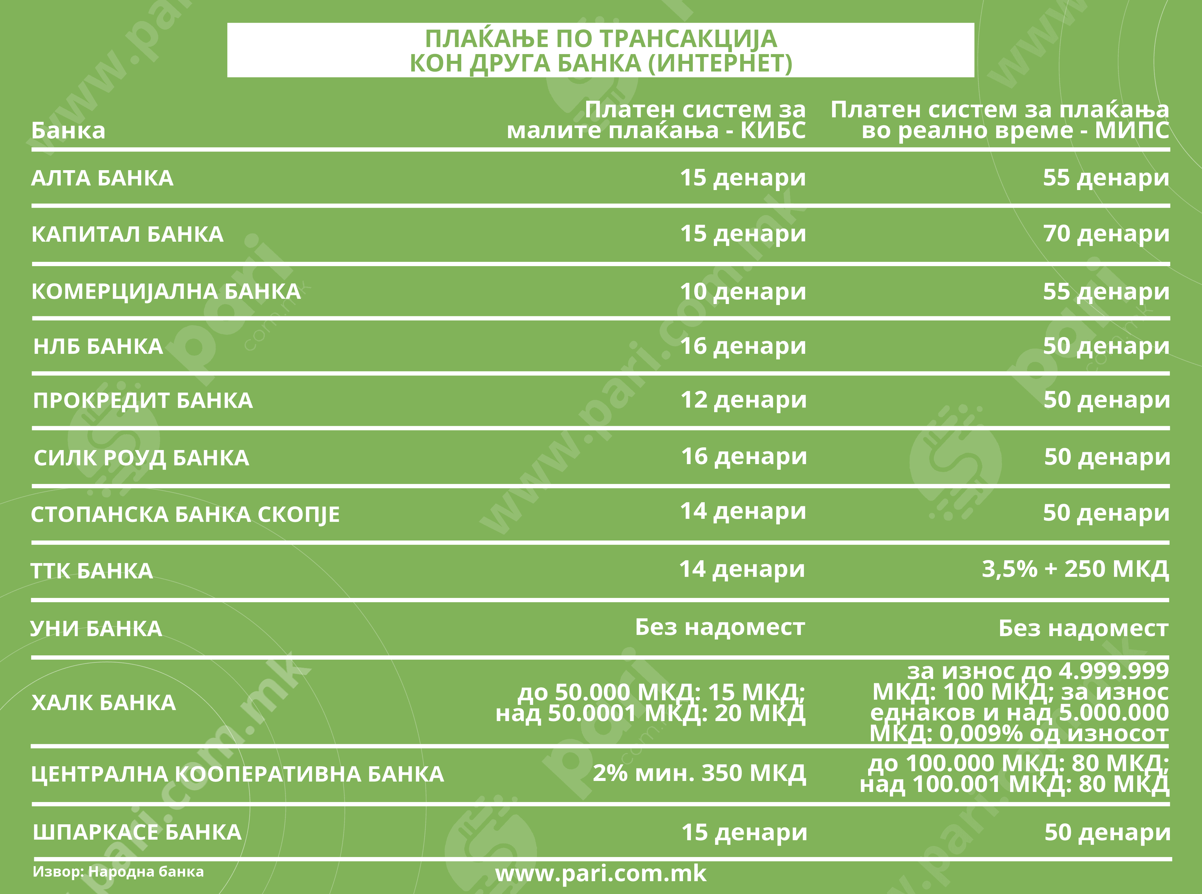 За кредитен трансфер во денари преку интернет мрежата, кога средствата се префрлаат на сметка во истата банка, не наплатуваат надомест: Алта банка, Комерцијална банка, НЛБ банка, ПроКредит банка, Силк Роуд банка, Стопанска банка Скопје, ТТК банка, УНИ банка и Шпаркасе банка.