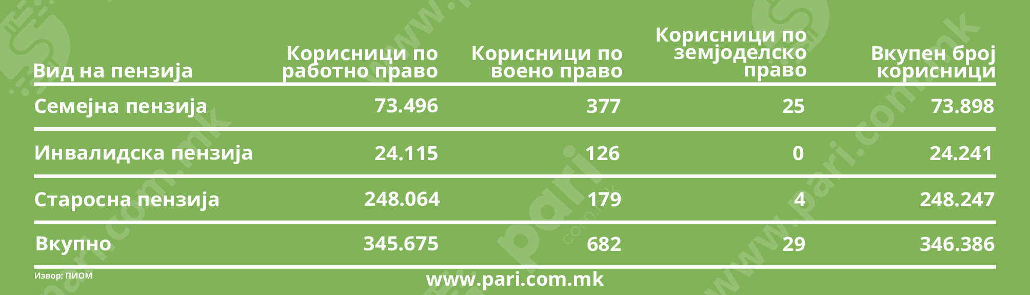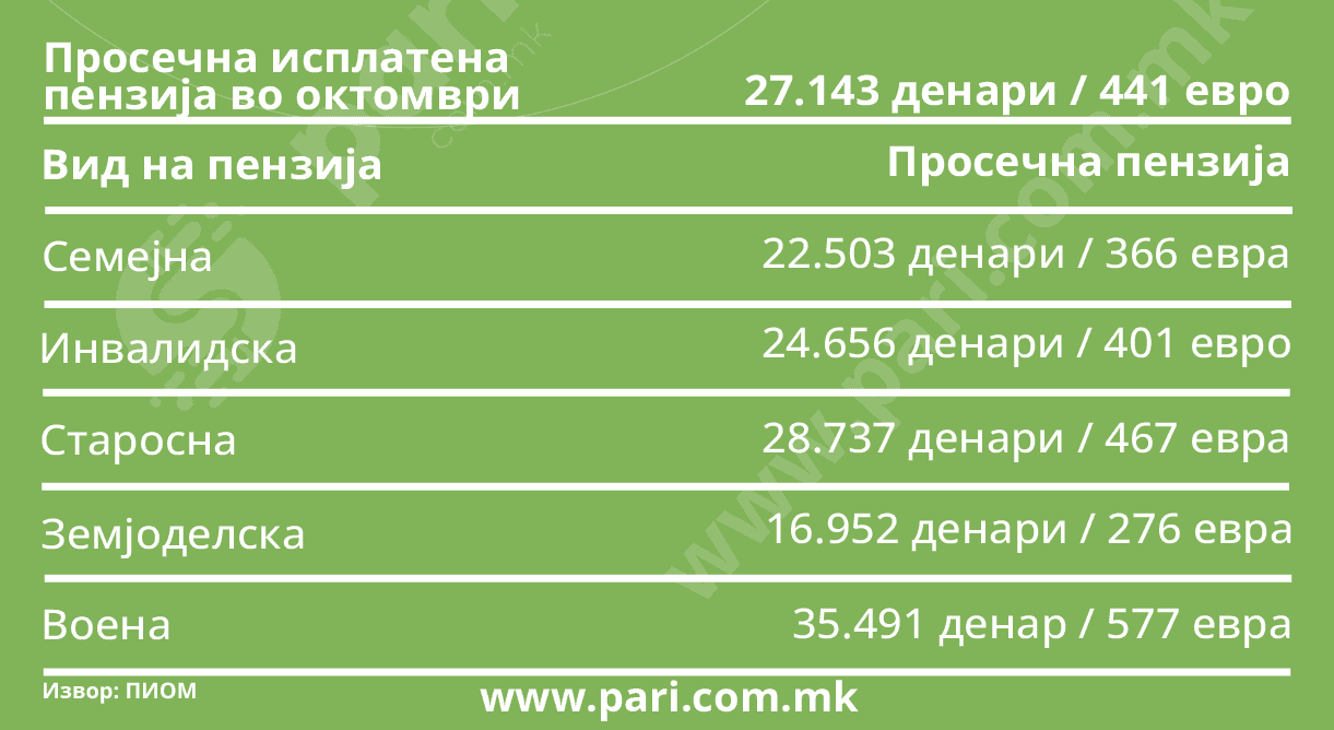 Од сите тие пензии исплатени во октомври произлегува просекот од 441 евро. Во неговата изградба најголем е придонесот на воените, па на старосните пензии.