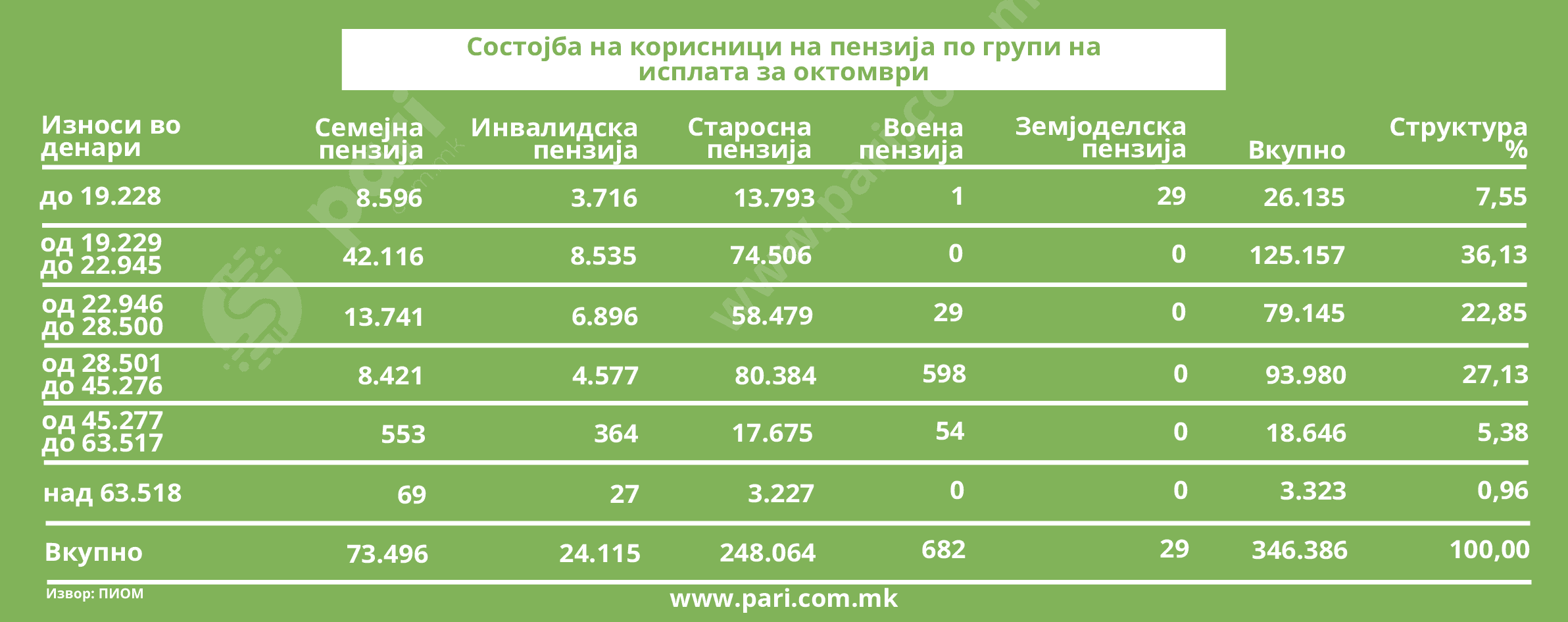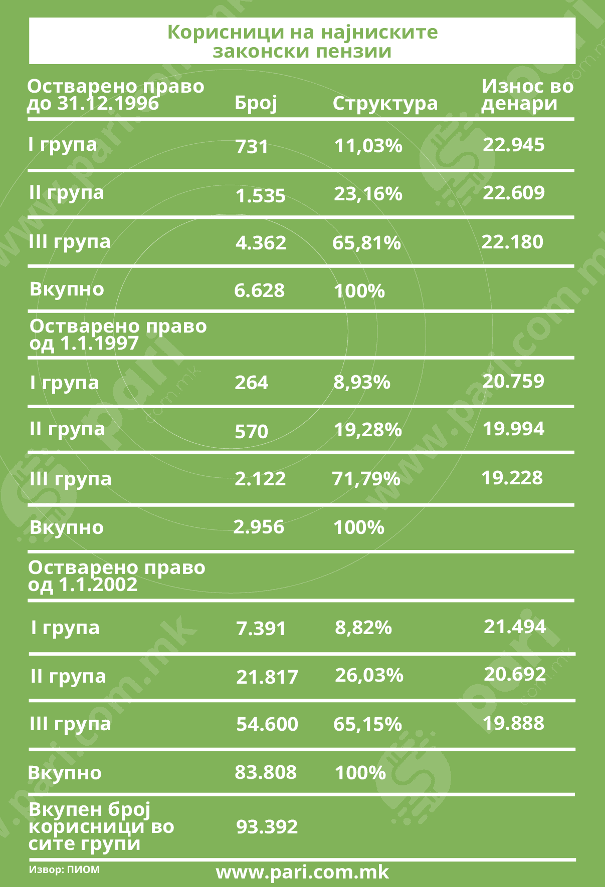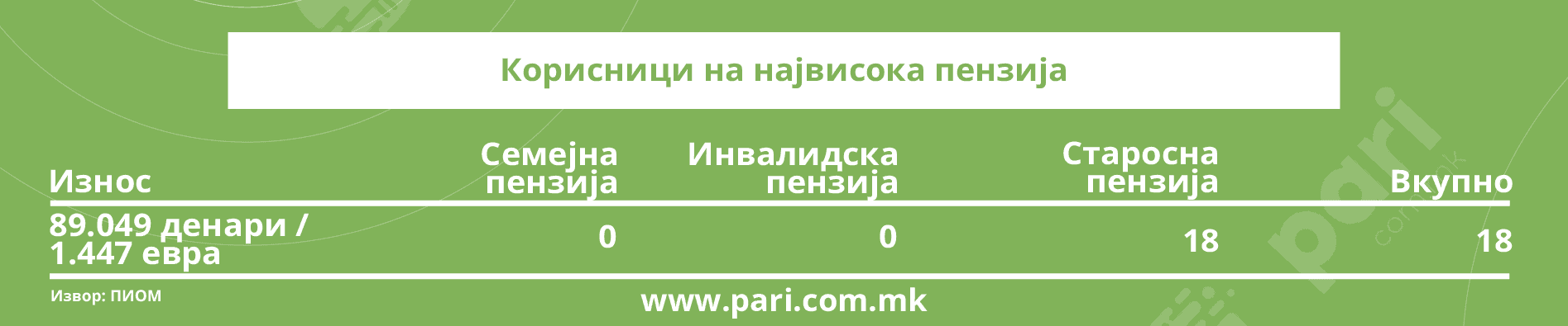 Освен тие повеќе од 36 отсто од пензионерите со најниски пензии, добар дел, односно 27,13 отсто се во групата кадешто пензионерските примања се од 463 до 736 евра. А, нецел еден процент, поточно 0,96 отсто се приматели на пензиите што го преминуваат прагот од илјада евра.