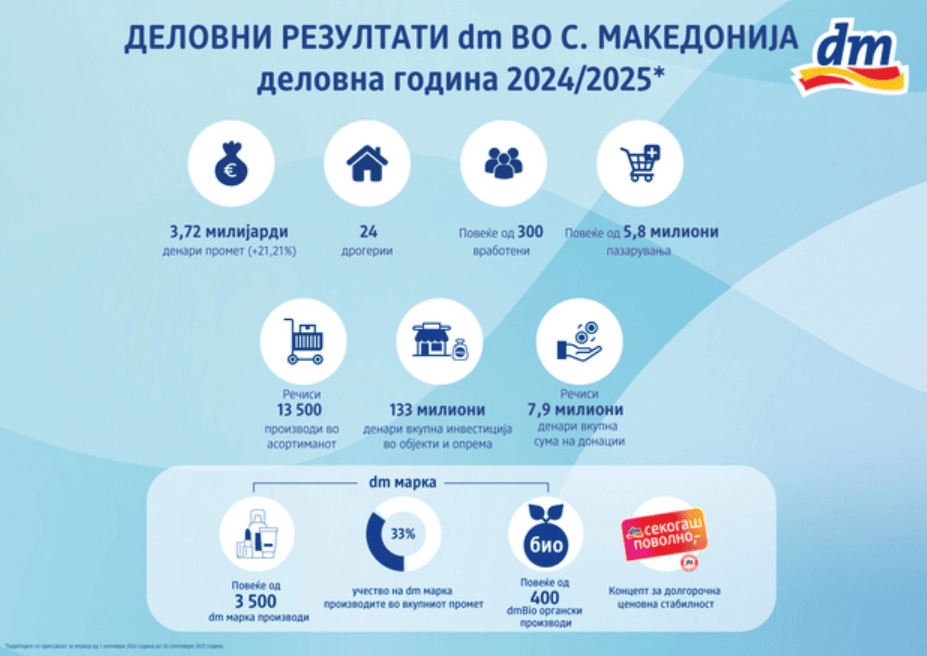 Со вкупен промет од 3,72 милијарди денари што претставува раст од 21,21 отсто, компанијата dm drogerie markt забележа уште една успешна година со што дополнително ја зацврсти позицијата меѓу водечките малопродажни синџири на македонскиот пазар. Вкупните инвестиции во изминатата година изнесуваа 133 милиони денари, што сведочи за континуиран развој на продажната мрежа, воведување нови технолошки решенија и континуирано одржливо работење. dm drogerie markt во нашата земја е присутен во 10 градови, со 24 продажни објекти.