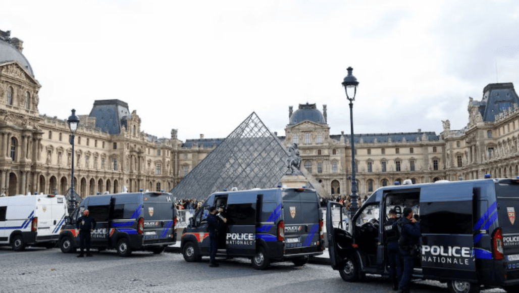 Во недела, на 19 октомври, двајца мажи паркирале лифт за преселба пред Лувр, се качиле на вториот кат и скршиле прозорец. Тие отвориле витрини со аголни брусилки, а потоа избегале на скутери управувани од двајца соучесници во грабеж што траел помалку од седум минути.