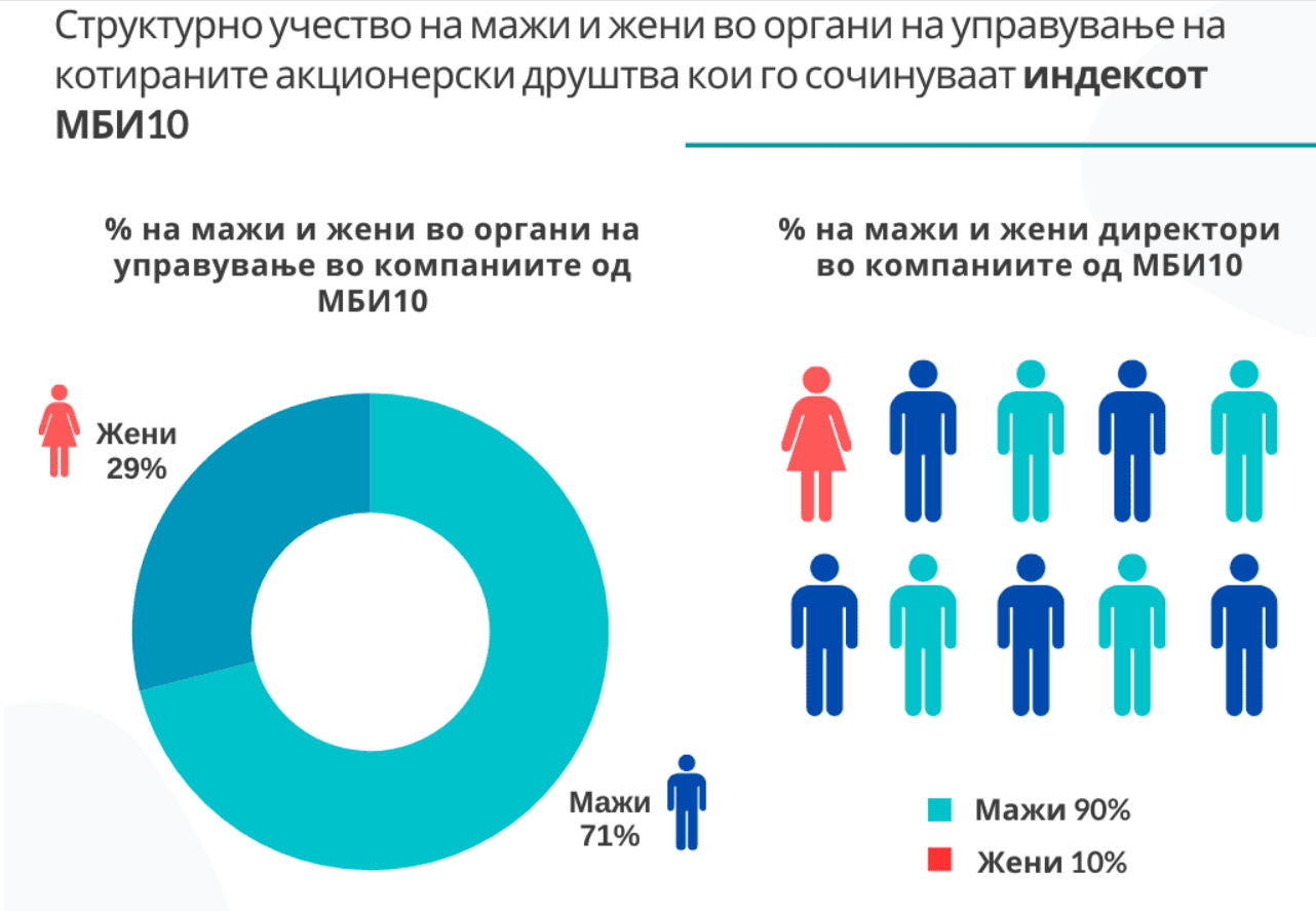 Кај компаниите кои го сочинуваат берзанскиот индекс МБИ10, родовата застапеност е нешто подобра. Во овие компании 29 отсто од членовите на органите на управување се жени. Сепак, само една компанија е управувана од жена извршен директор или претседател на управен одбор.