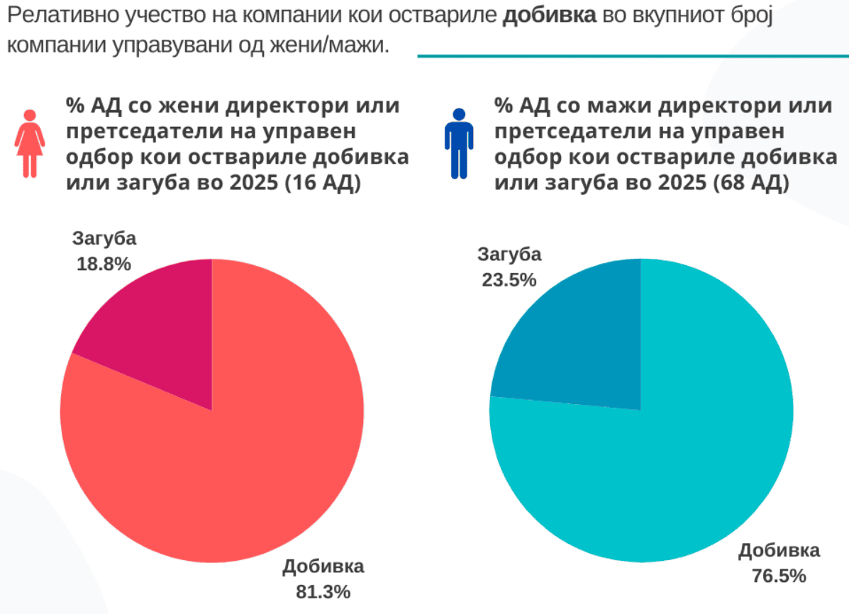 Конкретно, од 16 котирани компании управувани од жени, дури 81,3 отсто оствариле добивка во 2025 година. Кај компаниите управувани од мажи, 76,5 отсто од вкупно 68 компании пријавиле добивка. Или, родова разновидност во управувањето може да има позитивно влијание и врз деловните резултати на компаниите.