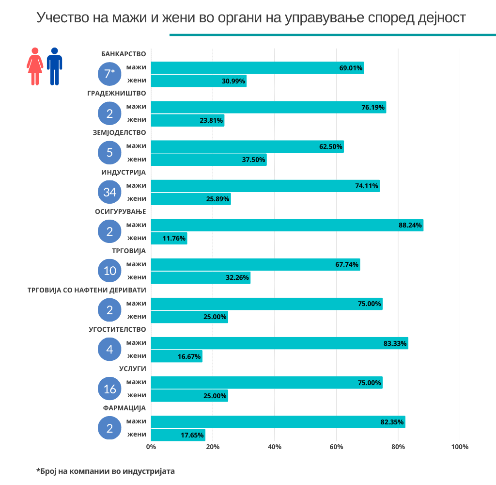 Родовата структура, според анализата, значително варира и во зависност од дејноста на компанијата. Најголеми машко-женски разлики во управувањето се забележуваат во три сектори. Во осигурувањето соодносот е 88,24 % спрема 11,76 %. Во угостителството – 83,33 % спрема 16,67 %. А, во фармацијата, мажите доминираат со 82,35 % наспроти женскиот дел од 17,65 отсто.