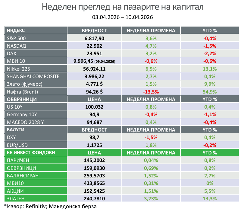 Во рамки на S&P 500, енергетскиот сектор беше единствениот со негативен резултат поради падот на цените на нафтата. Инфлацијата во САД за март забрза поради повисоки трошоци за енергија, но сепак беше под пазарните очекувања, додека основната инфлација остана стабилна. Реалниот економски раст за четвртиот квартал од 2025 година беше ревидиран надолу, што укажува на забавување на економијата. Активноста во услужниот сектор значително ослабна, придружена со нагло зголемување на цените. Довербата кај потрошувачите според University of Michigan падна на историски најниско ниво, со силен раст на инфлациските очекувања. Европскиот индекс STOXX Europe 600 порасна, иако Европската унија предупреди на можно намалување на економските прогнози. Јапонскиот Nikkei 225 забележа силен раст и закрепнување на пазарот. Американскиот долар ослабна во текот на целата недела, враќајќи се блиску до нивоата од пред конфликтот. Златото порасна трета недела по ред и служеше како сигурно засолниште во услови на неизвесност. Биткоин исто така оствари значителен раст и достигна највисоки нивоа од средината на март. Цените на нафтата и понатаму се на релативно високо ниво, поради застојот во транспортот, поради оштетувања на енергетската инфраструктура и намаленото производство во Персискиот залив. И покрај стабилизацијата и оптимизмот на финансиските пазарите, песимизмот кај потрошувачите, намалениот раст и инфлаторниот притисок, го зголемуваат ризикот од стагфлација.