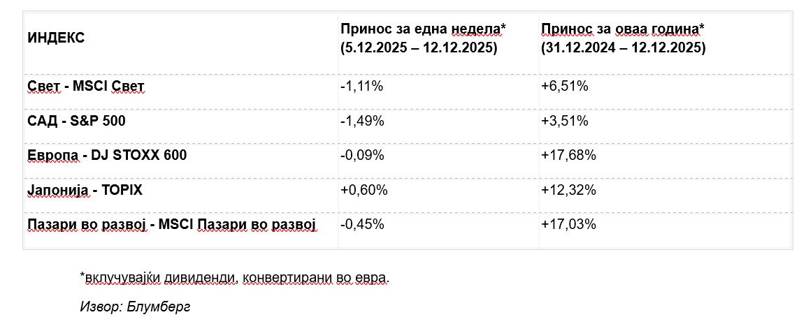Третото намалување на каматните стапки од страна на Федералните резерви оваа година беше очекувано, инвеститорите се фокусираа првенствено на изјавите на Централната банка во врска со идните случувања во монетарната политика. Според аналитичарите, тонот на ФЕД беше помалку рестриктивен од пазарните очекувања, што предизвика пораст на цените на акциите. Индексите Dow Jones, S&P 500 и Russell 2000 достигнаа нови рекордни вредности во долари. Сепак, кон крајот на неделата, расположението на пазарот малку се смени. Резултатите на Oracle не беа импресивни, бидејќи компанијата забележа помал раст на приходите од очекувањата на аналитичарите, а дополнителна загриженост предизвикуваат и обемните инвестиции на Oracle во центри за податоци, кои се изложени на ризик да не ги постигнат посакуваните приноси. Oracle ги финансира повеќето од овие инвестиции со долг, кој веќе надминува 100 милијарди долари. Цената на акциите падна за повеќе од 13% минатата недела и речиси се преполови од својот врв.